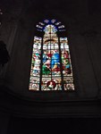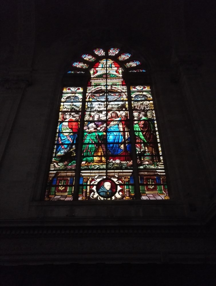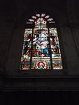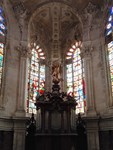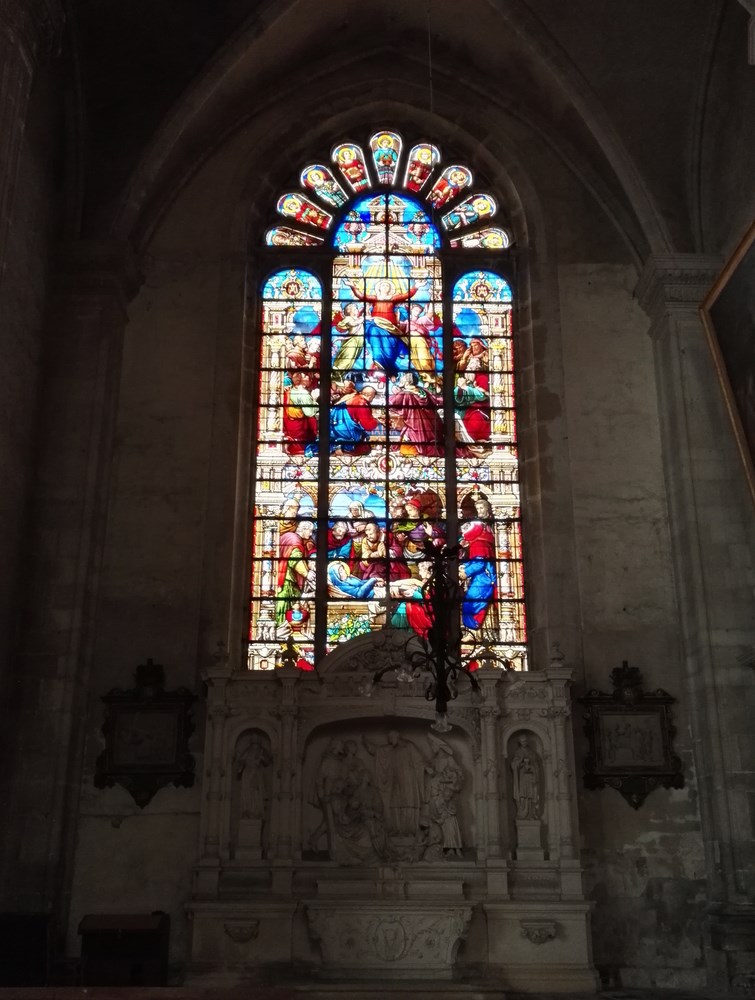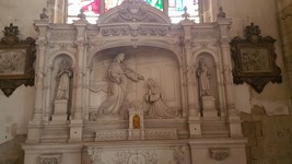 Un vitrail figurant la Dormition et l’Assomption de la Vierge, au premier plan, un retable en calcaire du m.XIX figurant saint Vincent de Paul et sainte Louise de Marillac.