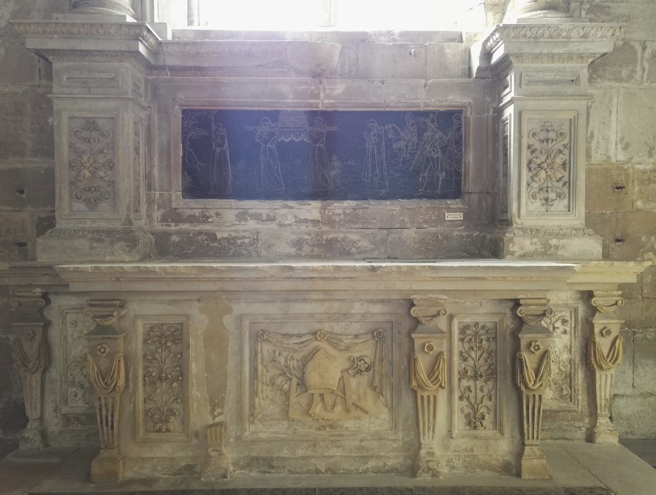 Autel en pierre orné d’une scène figurant la translation des reliques de saint-Anatole.
