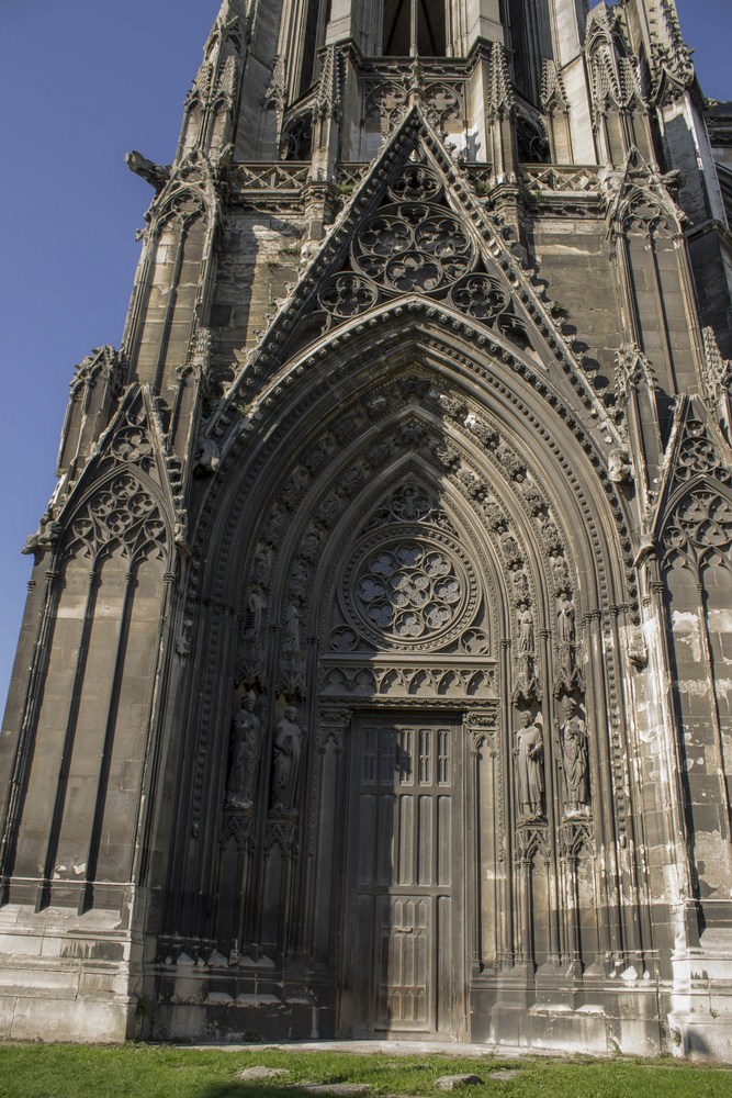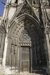 L’une des deux portes percées sur les flancs, ici au sud des statues représentant les abbés de Saint-Ouen.