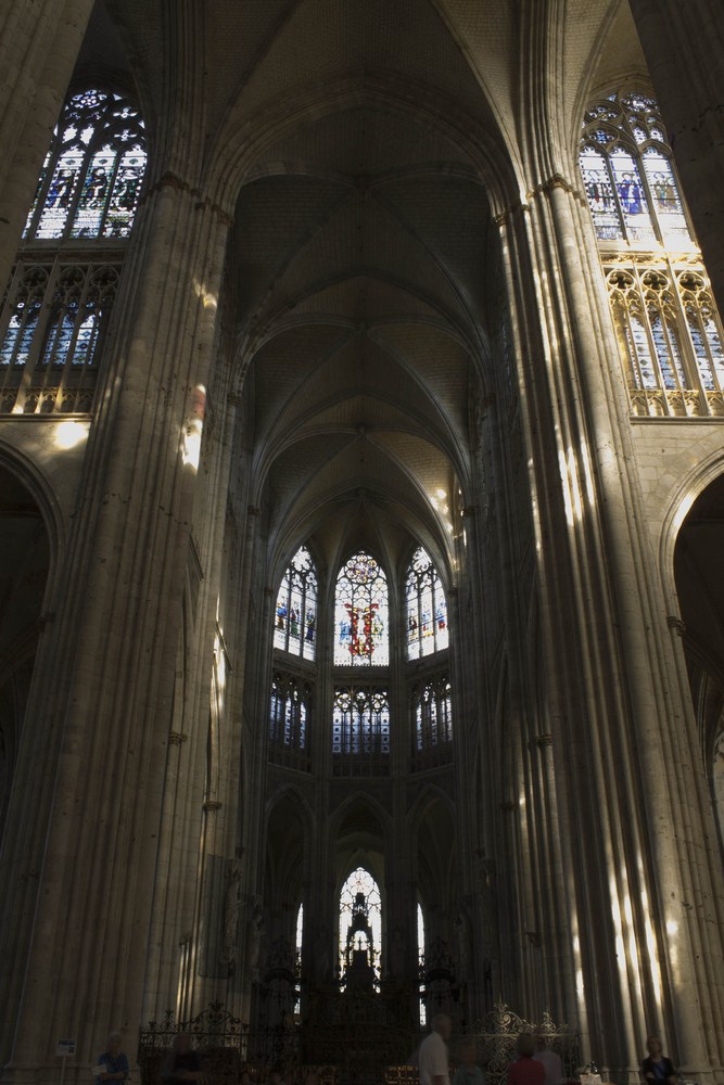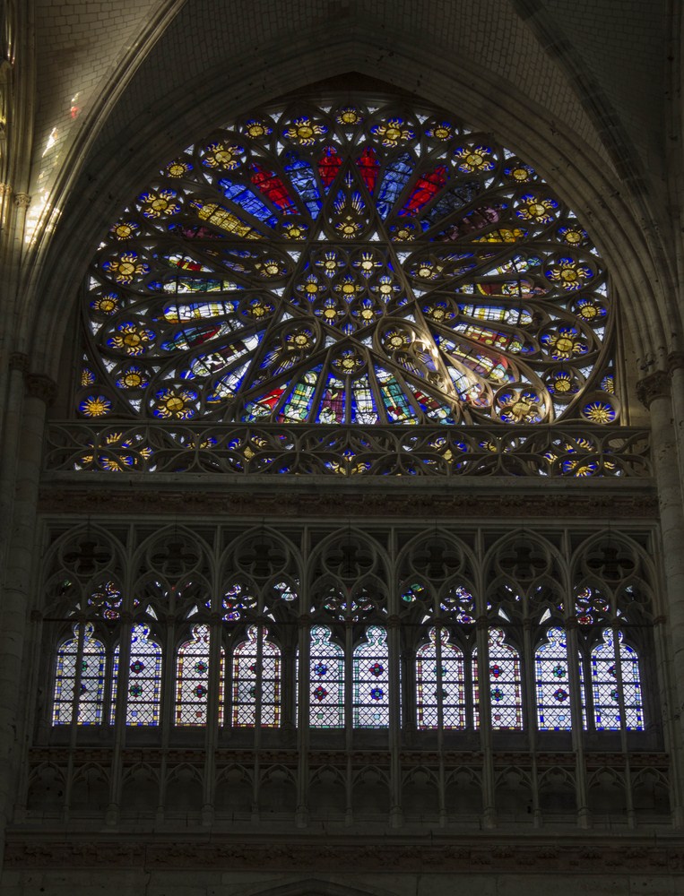 ⚐ 1537 – 1550 : On finit la nef et ses verrières, on pose la rose du portail nord et on réalise également la tour centrale couronnée flamboyante.