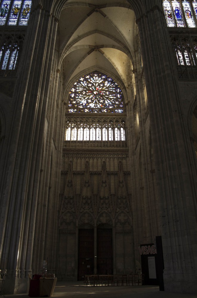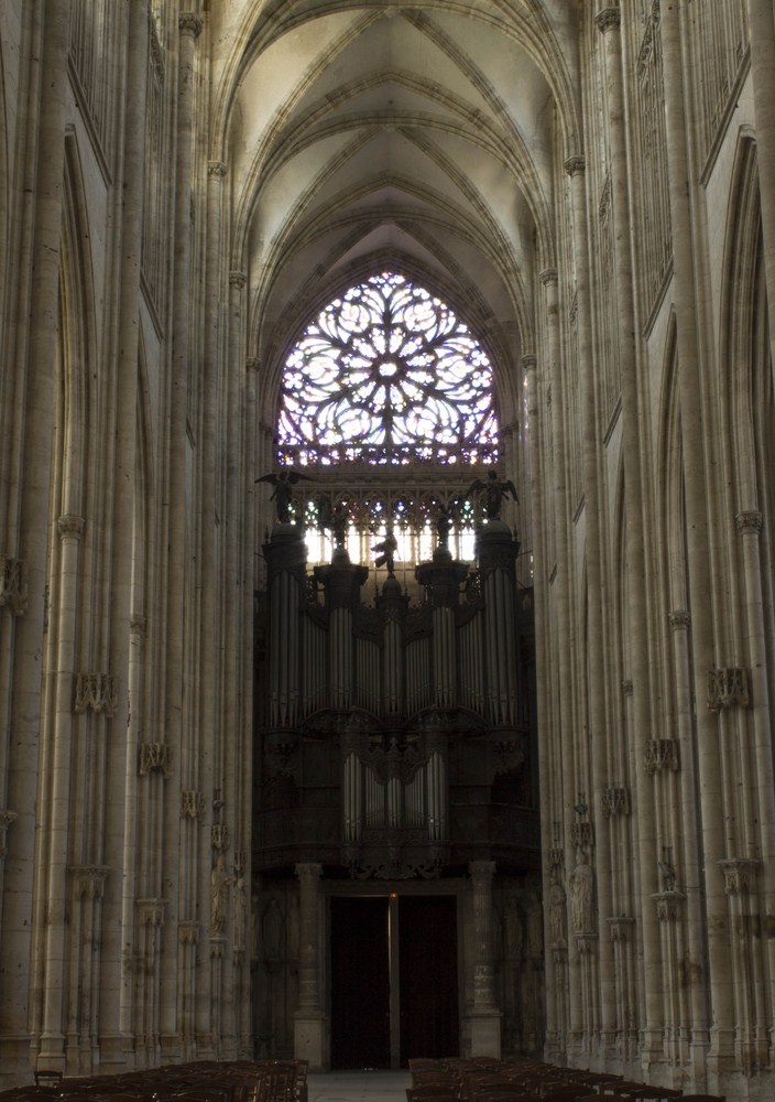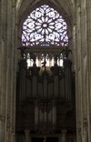 La nef et au fond, le grand orgue et la rosace se tenant derrière lui vus depuis le chœur.