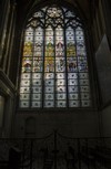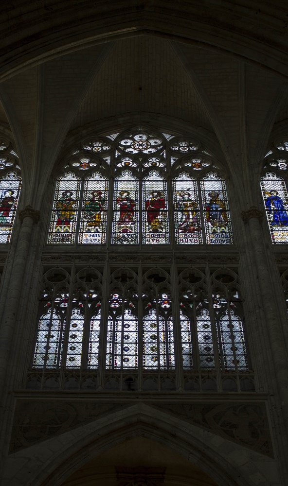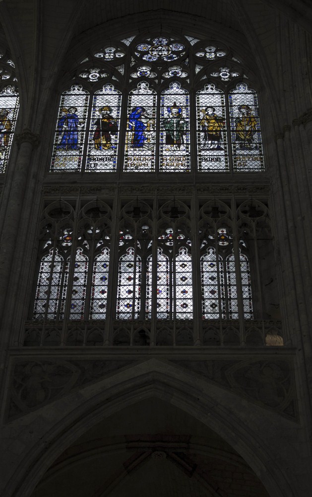 Vitraux de la troisième élévation፧ de la nef datant du XVI et figurant des saints.