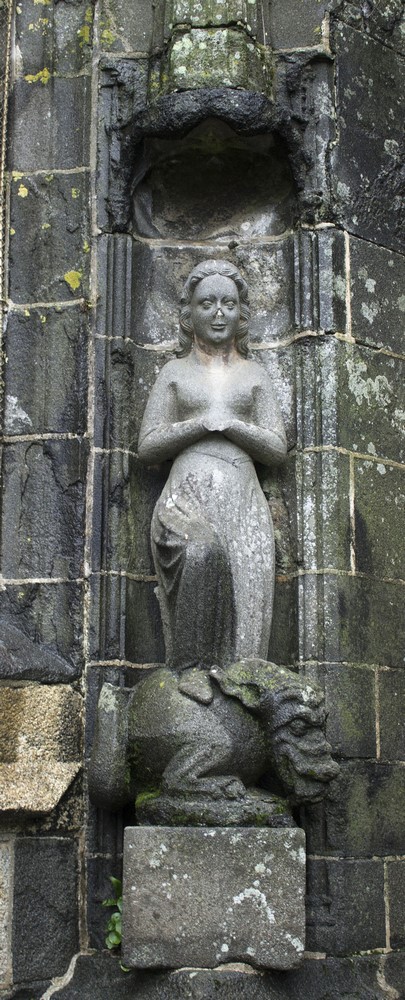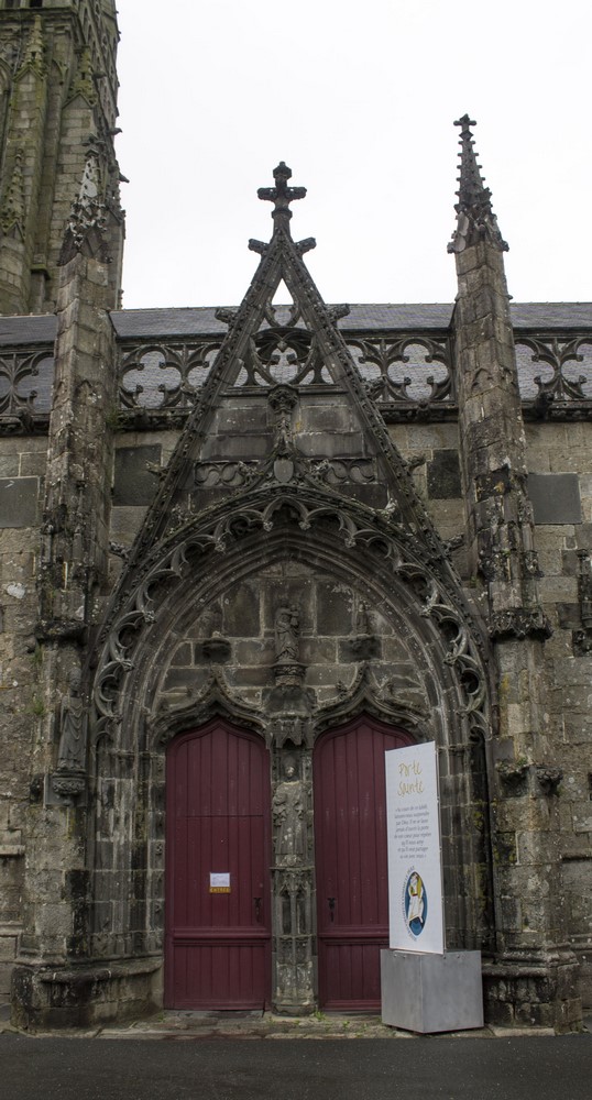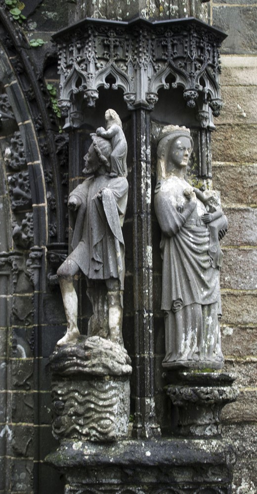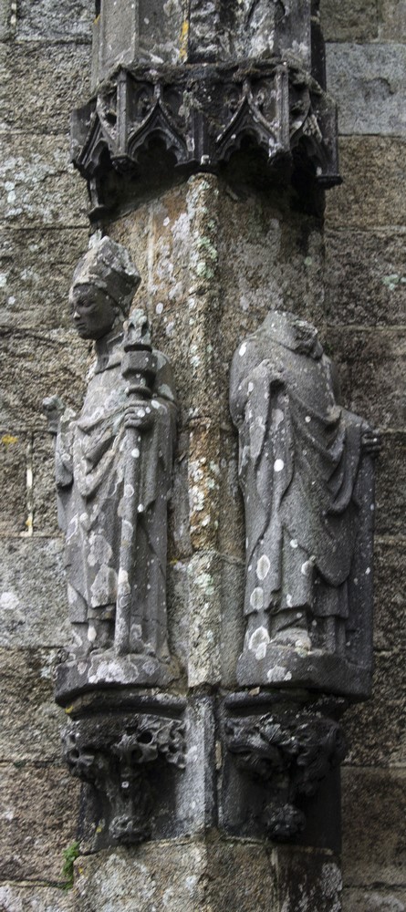 ● Le porche des apôtres, orienté ouest et menant directement au transept, en plus des douze statue d’une très bonne facture gardant l’intérieur du porche, quelques une situées à l’extérieur sont remarquable par leur iconographie empruntant à l’élément de l’eau. Ainsi on peut y voir à la droite du porche saint Christophe sur un rocher lui même flottant au dessus des eaux infernales puis coté gauche sainte Marguerite avec une morphologie rappelant une sirène terrassant un démon à coté de la vierge sur son croissant de lune foulant une sirène 🗎⮵, on peut noter sur celle-ci quelques autres curiosités comme la chaîne tenant sa cape et le petit objet qu’elle tient dans la main. Une statue de Jean V surplombe le porche avec, en dessous, une hermine entourée d’une banderole supportant sa devise : "À ma vie". Notons aussi la statue du Fou du Bois Salomon ôtant son chapeau et levant la tête, deux christ aux liens et une statue de saint Michel sur le porche occidental.