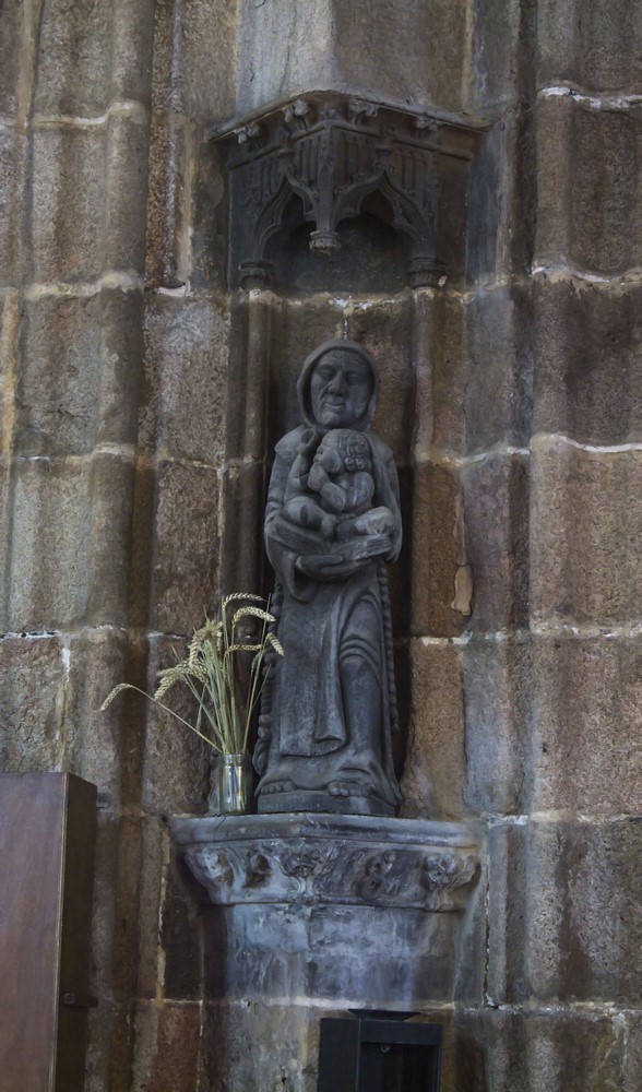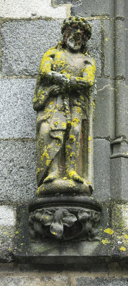 ► À l’orient, côté extérieur, une fontaine aménagée 🗎⮵ d’une statue de la vierge qui portait l’enfant Jésus (ôté durant la révolution) coule toujours le long d’une rigole, on dit qu’elle prend sa source sous la dalle du maître-autel, il est dit encore que Salaün ar Foll (Salomon, le Fou du Bois) y trempait régulièrement son pain.