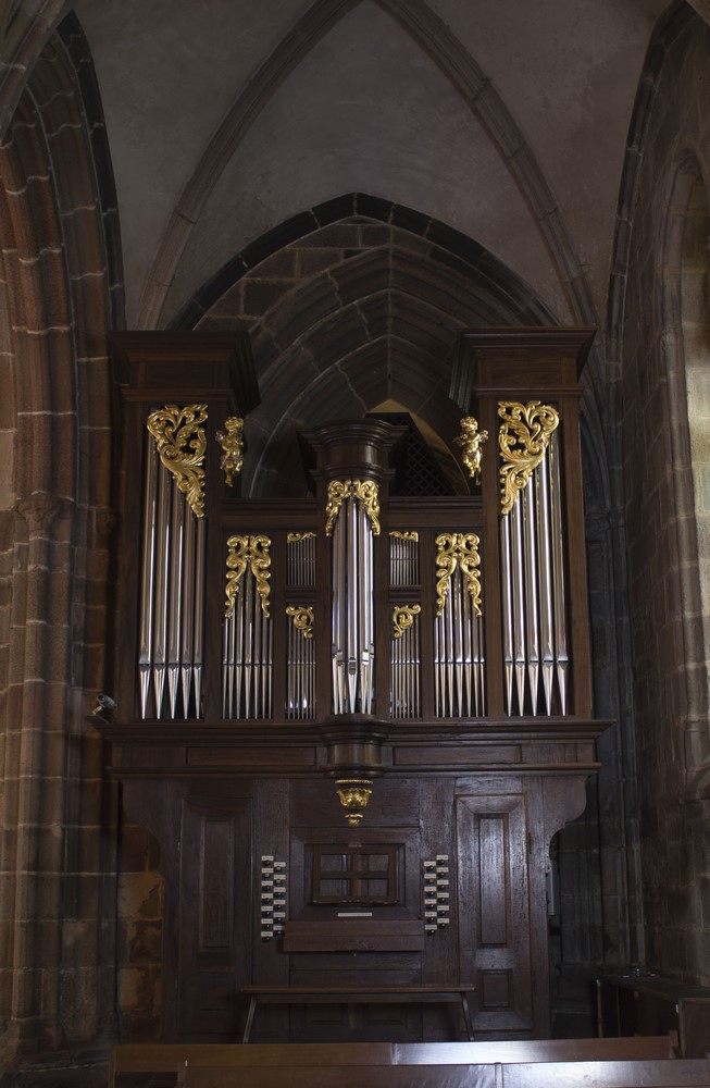 ► La basilique n’a pas été construite en croix latine comme la tradition le veut, mais en forme de L, ou plutôt d’un gamma grec majuscule (Γ). Un remarquable jubé 🗎⮵ ayant miraculeusement échappé aux vandalisme et aux aléas du temps se tient au chœur de l’édifice.