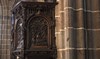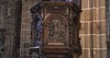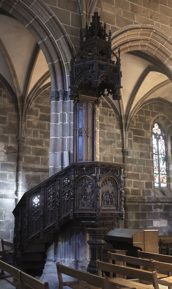 Chaire à prêcher du XIX sculptée en quatre bas-reliefs en bois racontant des évènements de la vie de Salomon le Fou.