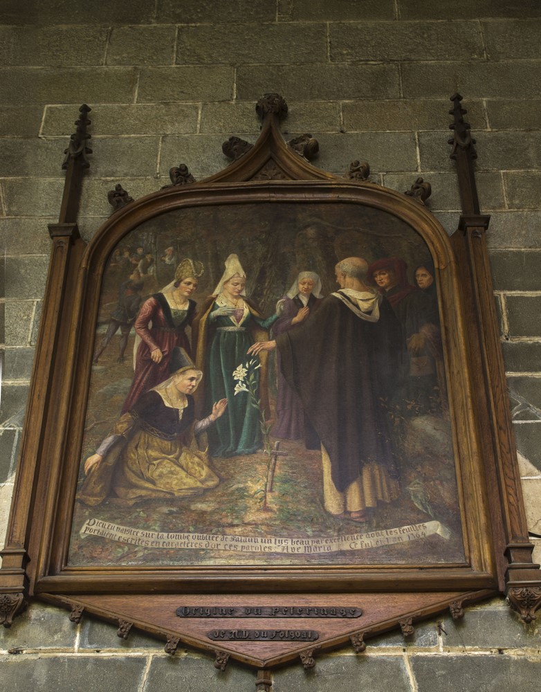 ◆ La construction de l’édifice, qui commença f.XIV, est à la gloire du saint Salomon, un homme considéré comme fou de son vivant qui vécut entre 1310 et 1358. Après sa mort, on remarqua qu’un curieux lys poussa au dessus de sa tombe, un lys sur lequel brillait des lettres d’or décrivant l’expression "AVE MARIA". L’on céda à l’envie de la rouvrir pour se rendre compte que le lys prenait racine dans la bouche du Fou. L’emplacement sera sacralisé au point qu’y sera construit l’actuel basilique consacré par le duc de Bretagne jean V. Quant au Fou du Bois, il sera élevé au rang de saint et son culte attira plusieurs personnages de haute noblesse dont Anne de Bretagne, sa fille la Reine Claude de France et son mari François Ier.