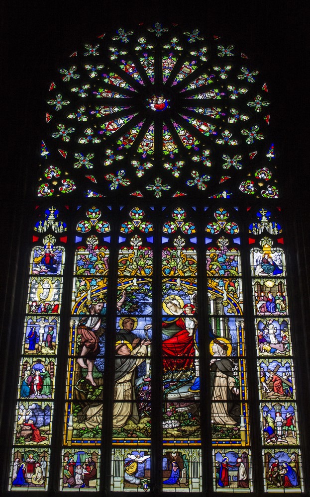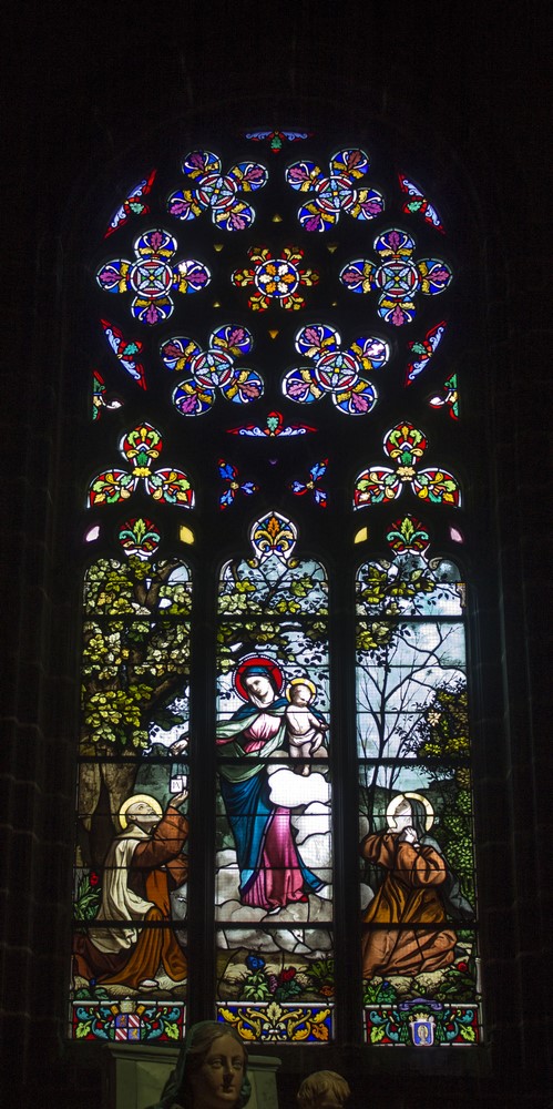 Nom : Vitrail du rosaire, Dominique accompagné de saint Vincent Ferrier et sainte Catherine de Sienne reçoit le Rosaire des mains de la Sainte Vierge.