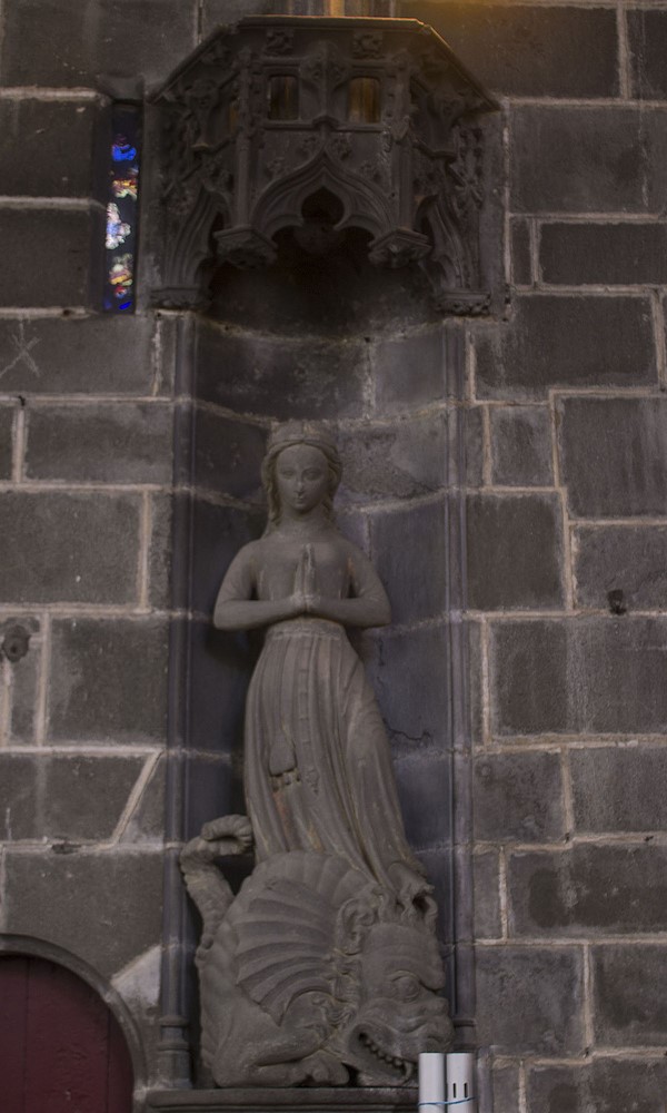 Statue à droite du porche aux apôtre de sainte Marguerite foulant un démon.