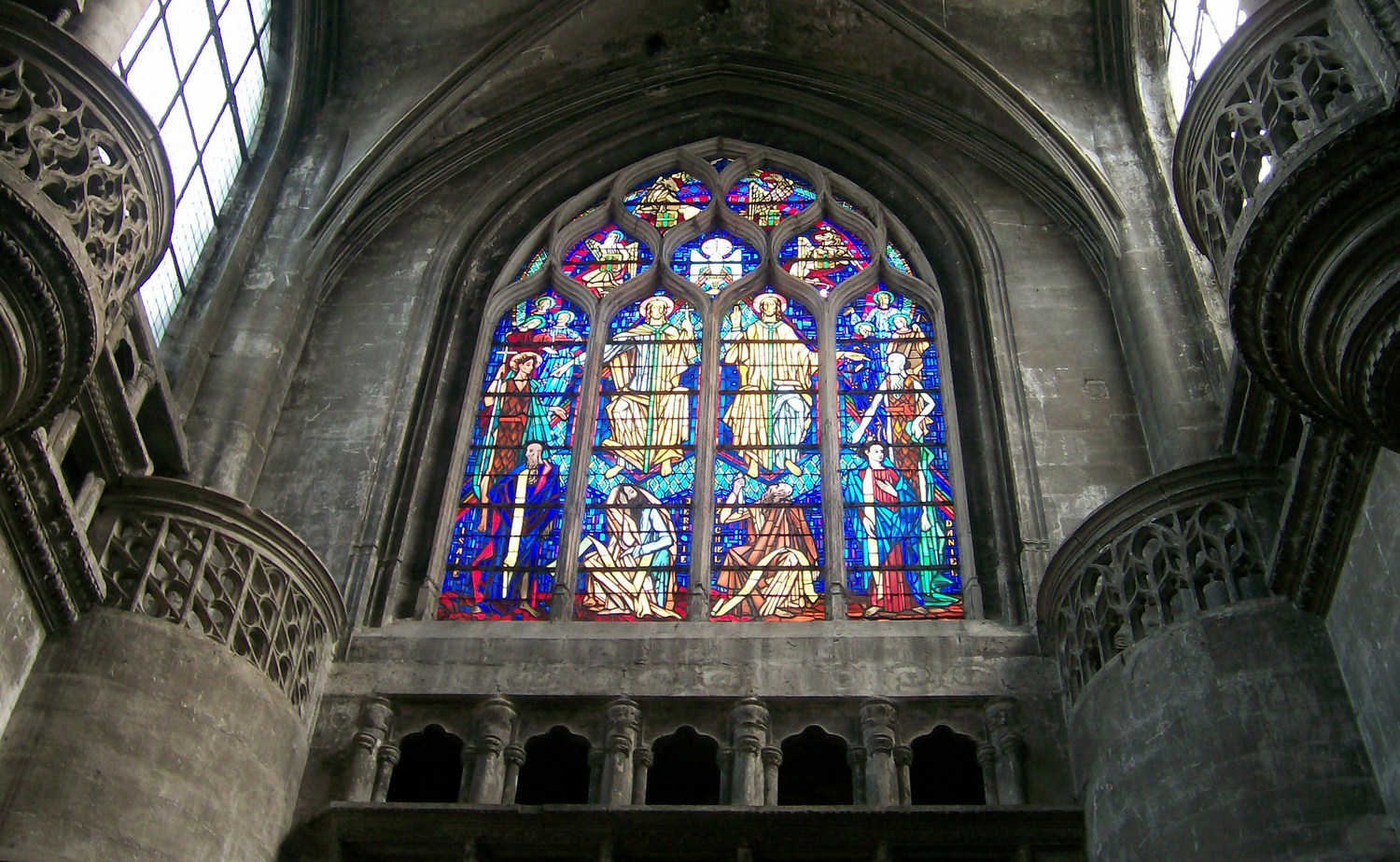 Verrière du transept sud de Calixte Poupart datant du XX et représentant les grands prophètes ainsi que la trinité et le tétramorphe.