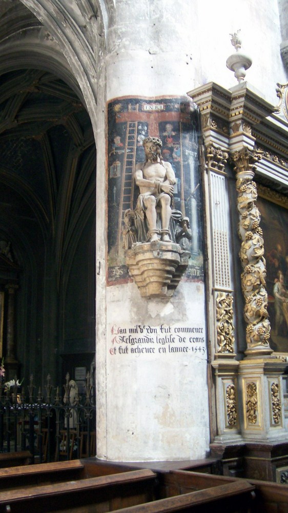 Christ aux liens sur une colonne du bras droit du transept, ce dernier est recouvert d’une peinture murale figurant les arma christi.