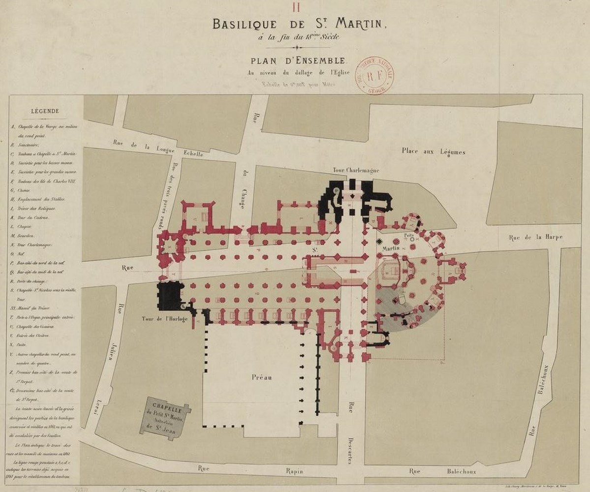 ⚒ ⚐ 1886 – 1902 : Reconstruction de la basilique suite à la redécouverte du tombeau de saint Martin en 1860, les plans sont bien plus modestes que l’édifice original dans la mesure où il aurait fallu démolir un axe important pour le commerce de Tours.
