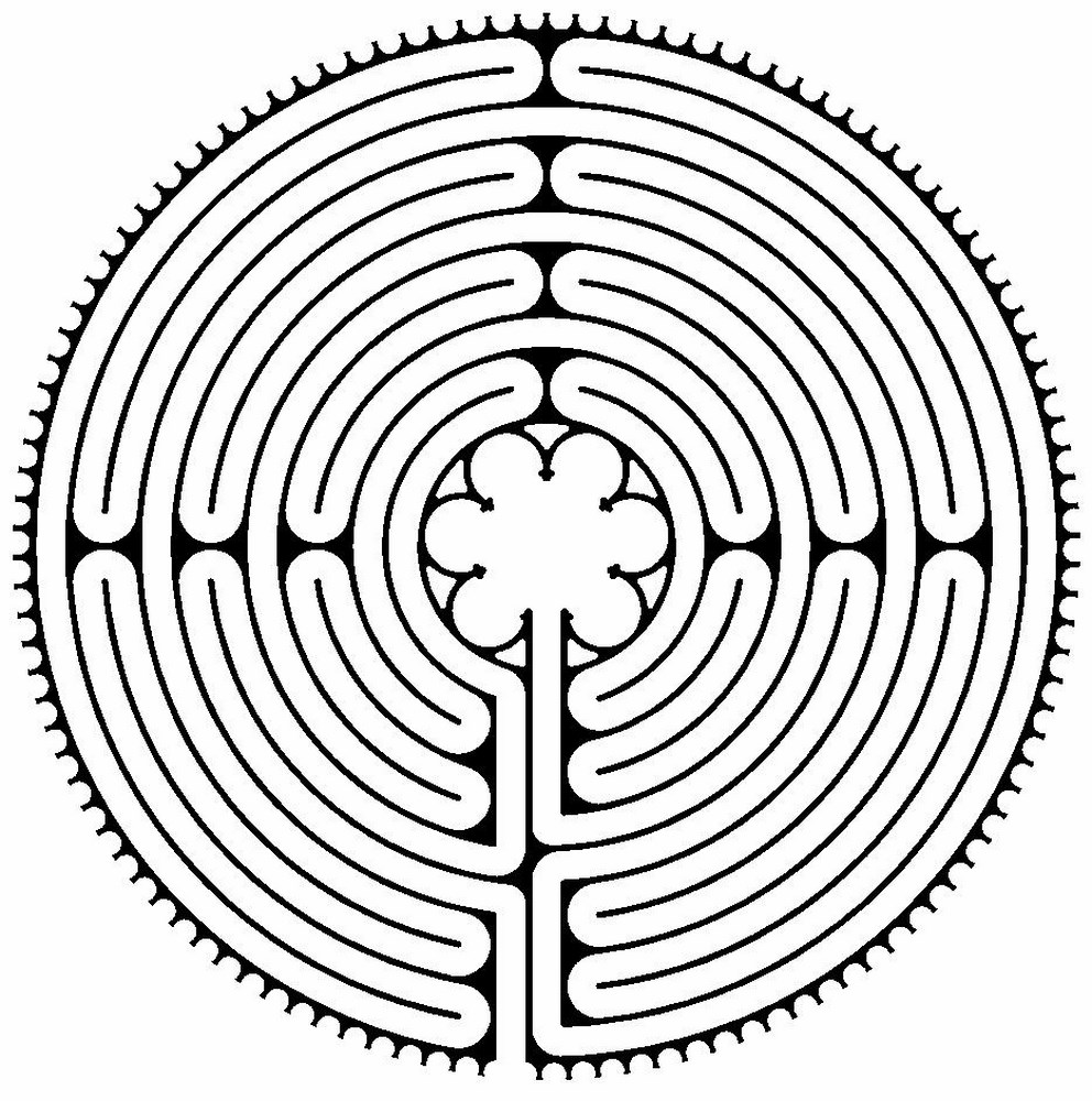 ◆ Le labyrinthe 🗎⮵, rare témoin d’une pratique alors répandue au XII est de forme circulaire, il mesure 12,89 mètres de diamètre pour un chemin long de 261,5m. ce qui en fait l’un des plus grands, il est composé de onze anneaux constitués de 365 dalles blanches et noires alternées. Le labyrinthe est situé au centre de la nef et la distance le séparant du Portail royal égale celle séparant le centre de la Rosace du Jugement dernier au sol. Ce Chemin de Jérusalem était orné d’une plaque de cuivre en son centre, ôtée en 1792, elle aurait représenté Thésée et le Minotaure.