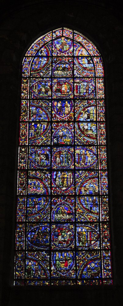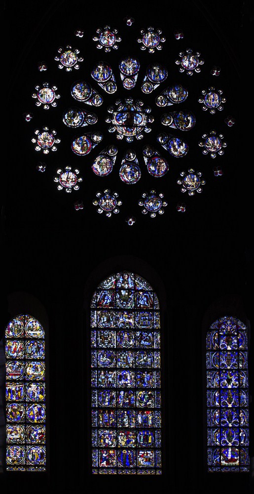 ► Construite sur l’ancienne cathédrale romane du XI qu’un incendie détruisit en 1194, la nouvelle cathédrale d’une superficie de 5200m2 est fondée sur les restes de son aînée ce qui explique entre autres raisons sa rapide construction : la crypte qui est la plus vaste de France et la façade occidentale de 30m de long ayant survécu à l’incendie, elles servent d’étalon au nouvel édifice. On ajoute tout d’abord deux éléments à la façade durant cette reconstruction : la rosace de 11,50m de diamètre représentant le Jugement dernier 🗎⮵ ainsi que juste au dessus, la galerie des seize rois de Juda suivis d’une Vierge à l’enfant et d’un Christ bénissant. La flèche flamboyante est ensuite ajoutée à la tour nord d.XVI.