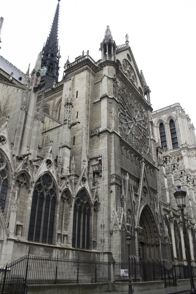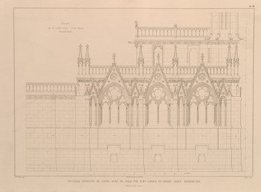 1845 – 1864 : Le succès du roman et l’influence du courant romantique qui renforce l’admiration des monuments de prestige tel Notre-Dame, permirent l’engagement de fonds pour sa restauration par l’assemblée nationale suite à un appel d’offres déposée par les architecte Jean-Baptiste-Antoine Lassus et Eugène Viollet-le-Duc. La cathédrale est restaurée dans un grand soucis d’authenticité et d’harmonie de style, on cherche dans un premier temps à lui redonner son aspect originel du XIII avant d’y ajouter entre autres la sacristie au sud de l’édifice.