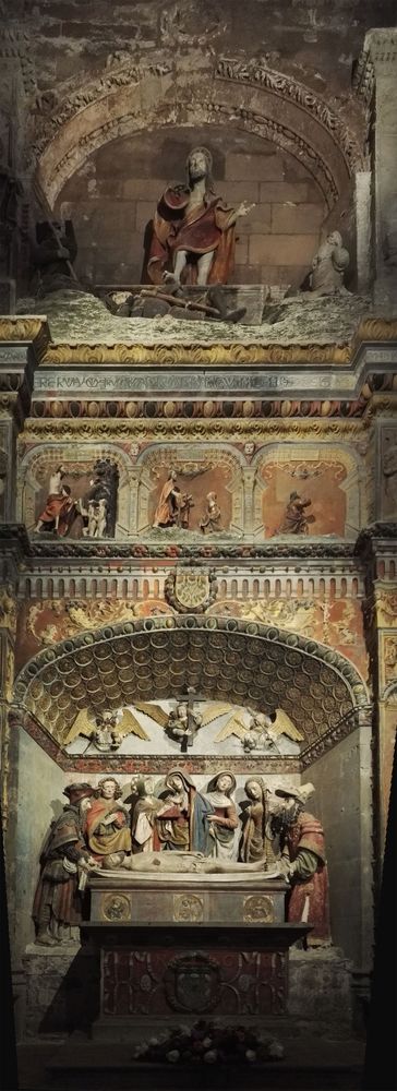 Nom : Retable de la mise au tombeau dans la Chapelle du Saint-Sépulcre (ou Gaillard Roux). Les scènes supérieures représentent la descente aux enfers, l’apparition à Madeleine et l’incrédulité de saint Thomas. Tout en haut, la Résurrection.