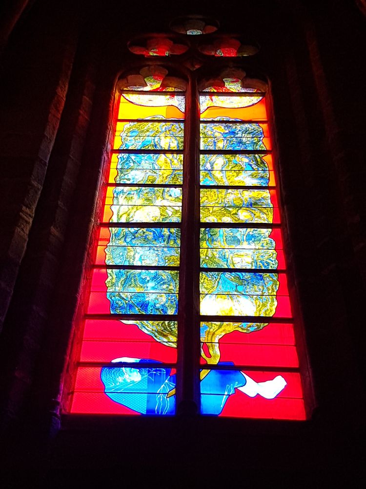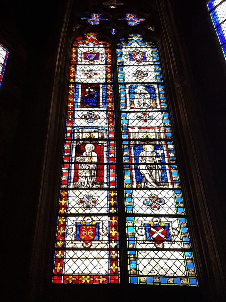Verrière composite XIV – XV de la chapelle Saint-Joseph acceuillant deux Vierges à l’enfant ainsi que Saint-Pierre et Saint-Paul. Il s’agit de la plus ancienne de l’édifice.