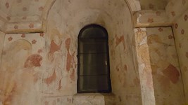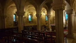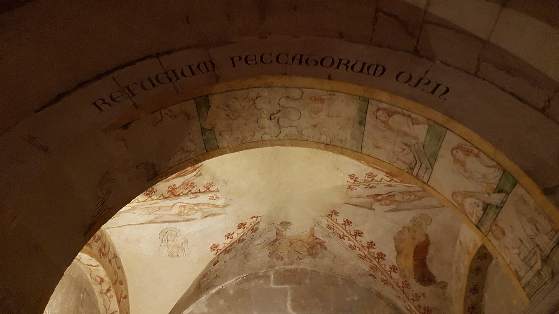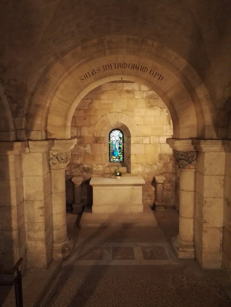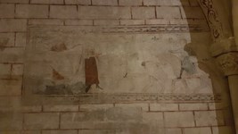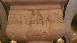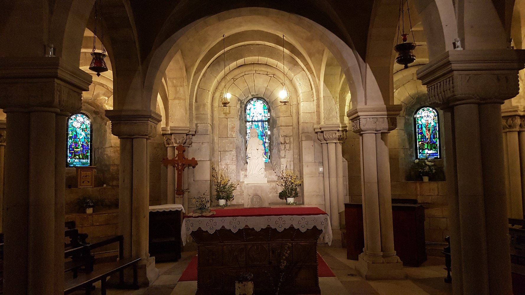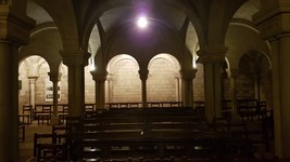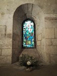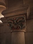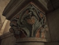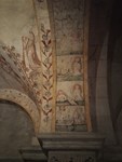 Crypte latérale droite pourvue de vitraux modernes et de chapiteaux et de fresques XV.