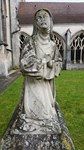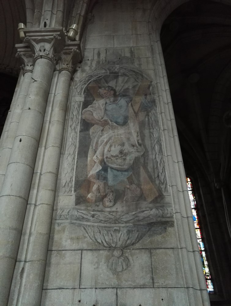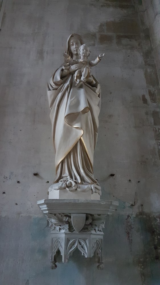 Statues du XII présentes à l’origine sur contreforts du chevet oriental, elles représentent Adam et Ève, l’Annonciation, Caïn et Abel, et un évêque (ℙ saint Saintin).