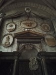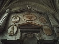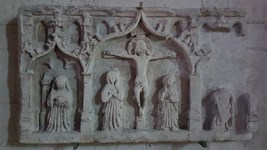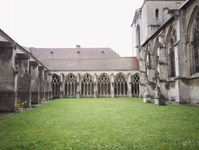 Allée du cloître menant à une Crucifixion en bois. Les bas-reliefs présents sur les monuments funéraires des chanoines Jean de Saint-Mihiel et Hubert de Parme morts en 1349, figurent un Couronnement de la Vierge à gauche et une Vierge à l’enfant à droite accompagnée de Sainte Agathe, les défunts sont agenouillés à leur cotés.