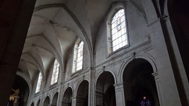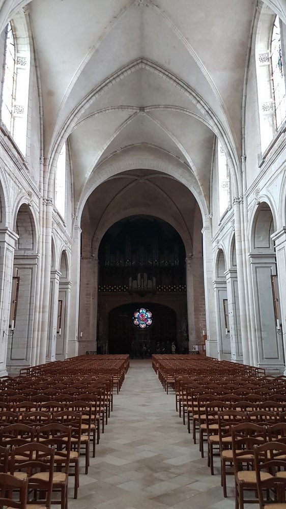 Nef et voûtes vues depuis le chœur oriental. Le chœur occidental est percé d’une verrière et surmonté d’un buffet Louis XV soutenant un orgue de tribune de 1767.