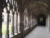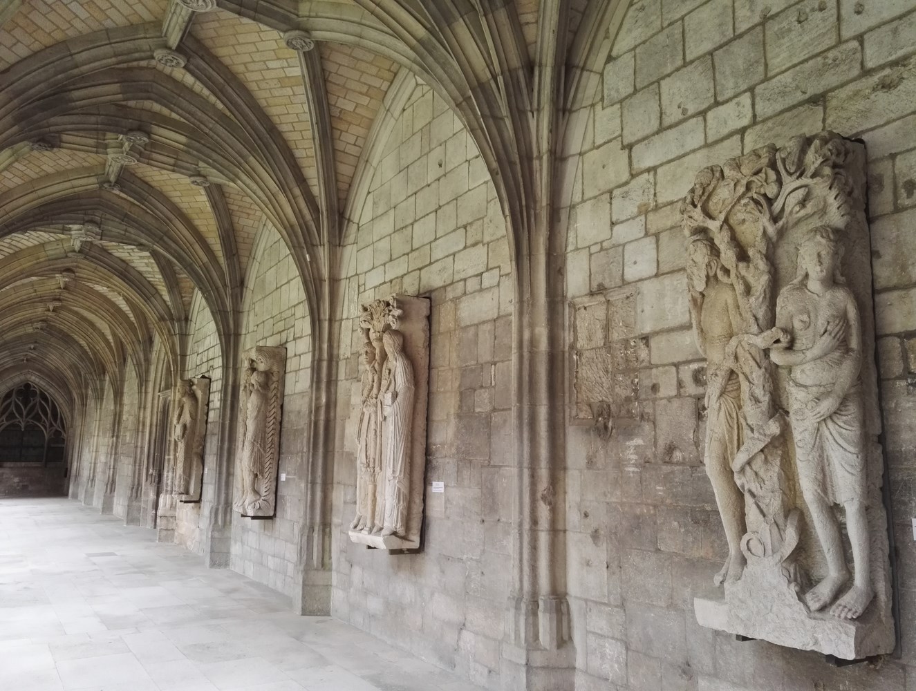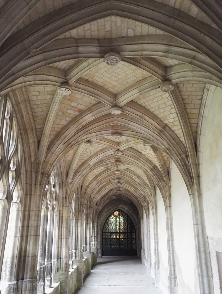 Allée du cloître où l’on voit des clefs de voûte décorées.