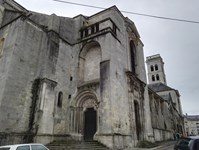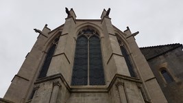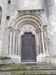 Abside orientale avec le Portail du Lion présentant un tympan du Christ en gloire. (Le lion en pierre qui était devant le portail est désormais visible musée de la Princerie)