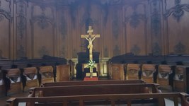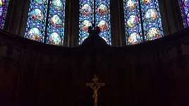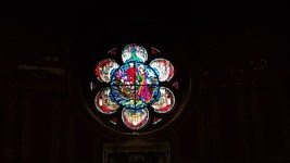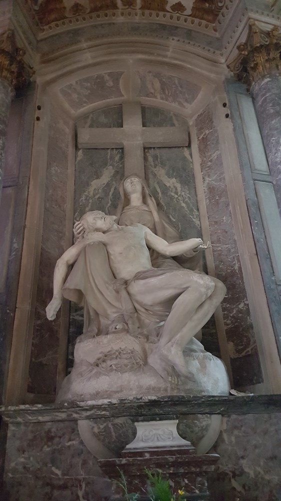 Nom : Chapelle du Chapelet avec sa pièta XVIII. Les vitraux figurent la bataille de Lepante, Saint Dominique prêchant le saint rosaire et la Transfiguration.