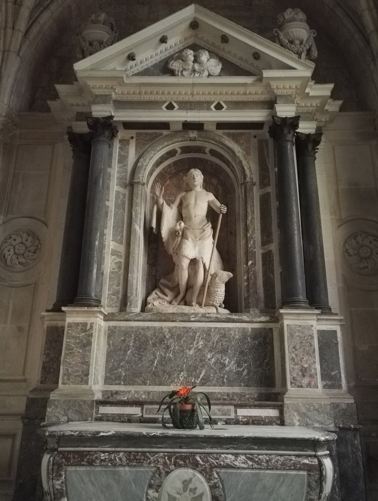 Nom : Chapelle Saint Jean-Baptiste avec statue d’après 1755 inspirée de l’Apollon du Belvédère. La verrière figure la vie du saint.