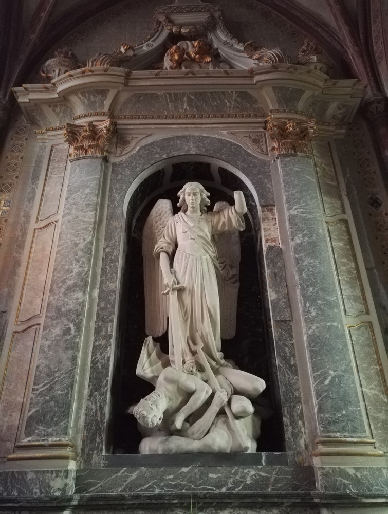Nom : Chapelle saint Jacques, Saint Christophe et Saint Phillipe avec un autel de 1755 surmonté d’une statue de Saint Michel terrassant le démon de 1895. Les lancettes figurent les saints à qui la chapelle est dédiée. Une statuette de saint Roch est visible contre le mur.