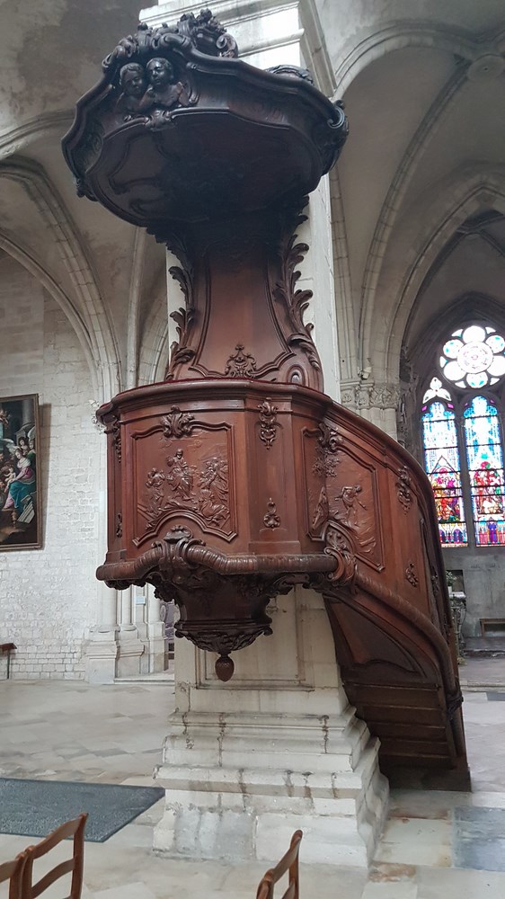 Chaire à prêcher en bois de 1760 présentant sur l’avant le Sermon sur la montagne.