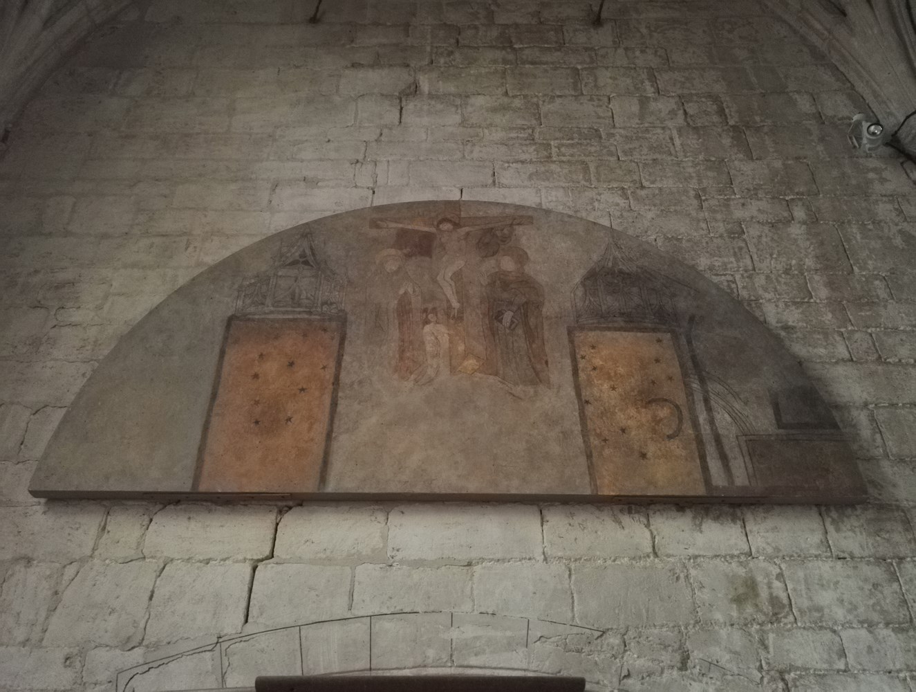 Nom : Chapelle de l’Assomption avec son retable de 1525 portant des médaillons de la litanie de la Vierge, le manteau est ℙ d’après le m.XVIII. À l’entrée de la chapelle se trouve une fresque de saint André.