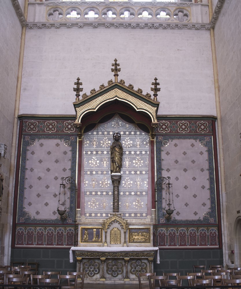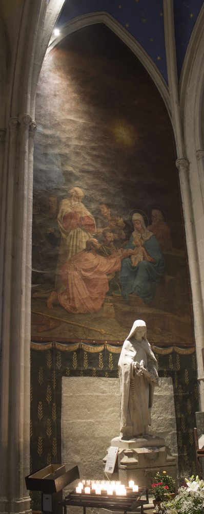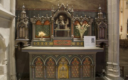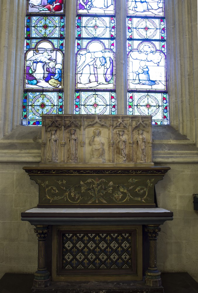 Retable en albâtre (XV), représentant Catherine, Marguerite et 2 abbesses avec le christ.