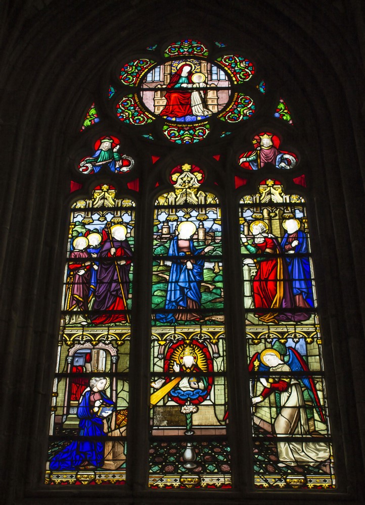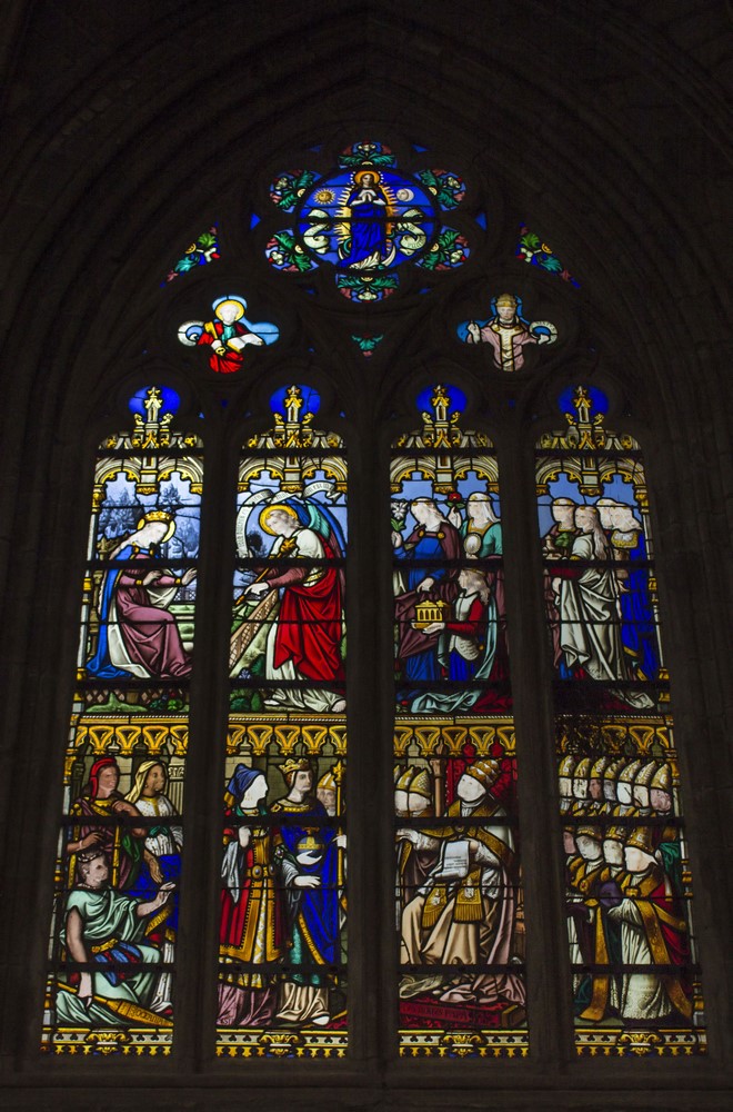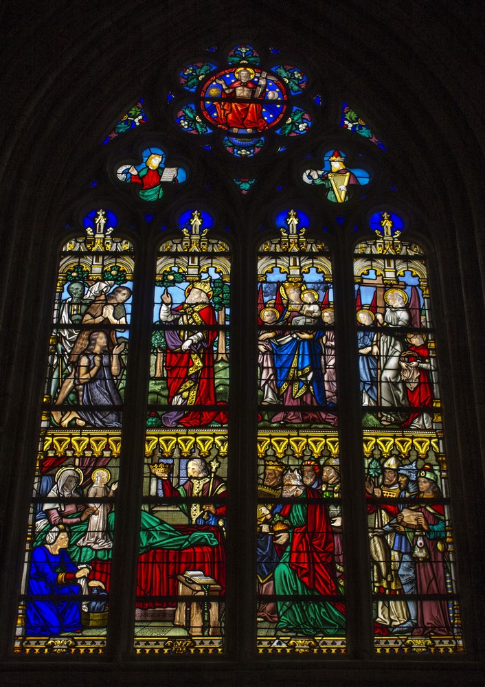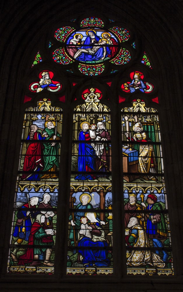 Vitrail de 1863, il décrit différentes étapes de la vie du Christ avec au centre les conciles de Nicée, de Latran et de Trente.