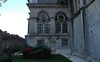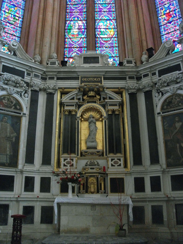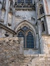 Coté extérieur gauche de la tour gauche avec non loin, la Chapelle des Évêques et une vue sur un vitrail du collatéral gauche.