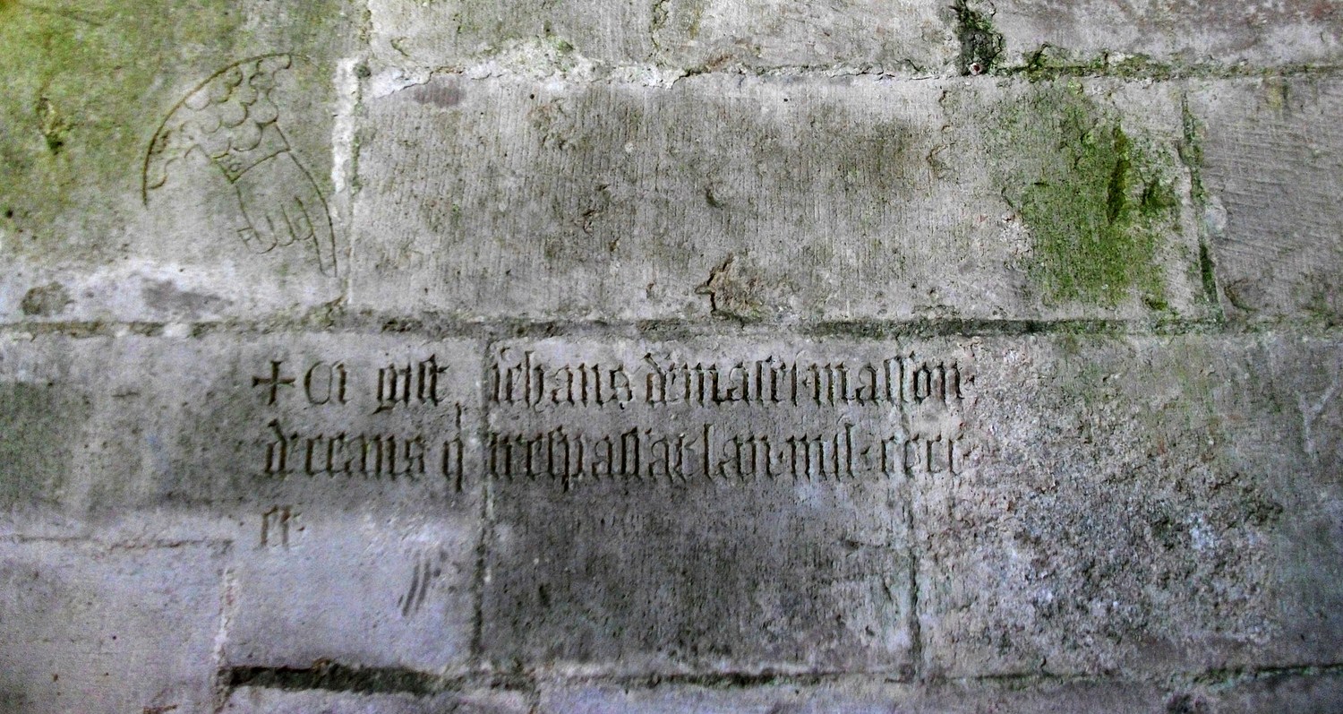 Ci gist, Jehans de Masey, masson de ceans qui trépassa l’an Mille CCCC et [… ?]et une base moulée figurant un homme vert régurgitant, toutes deux présentes sur un mur du cloître.
