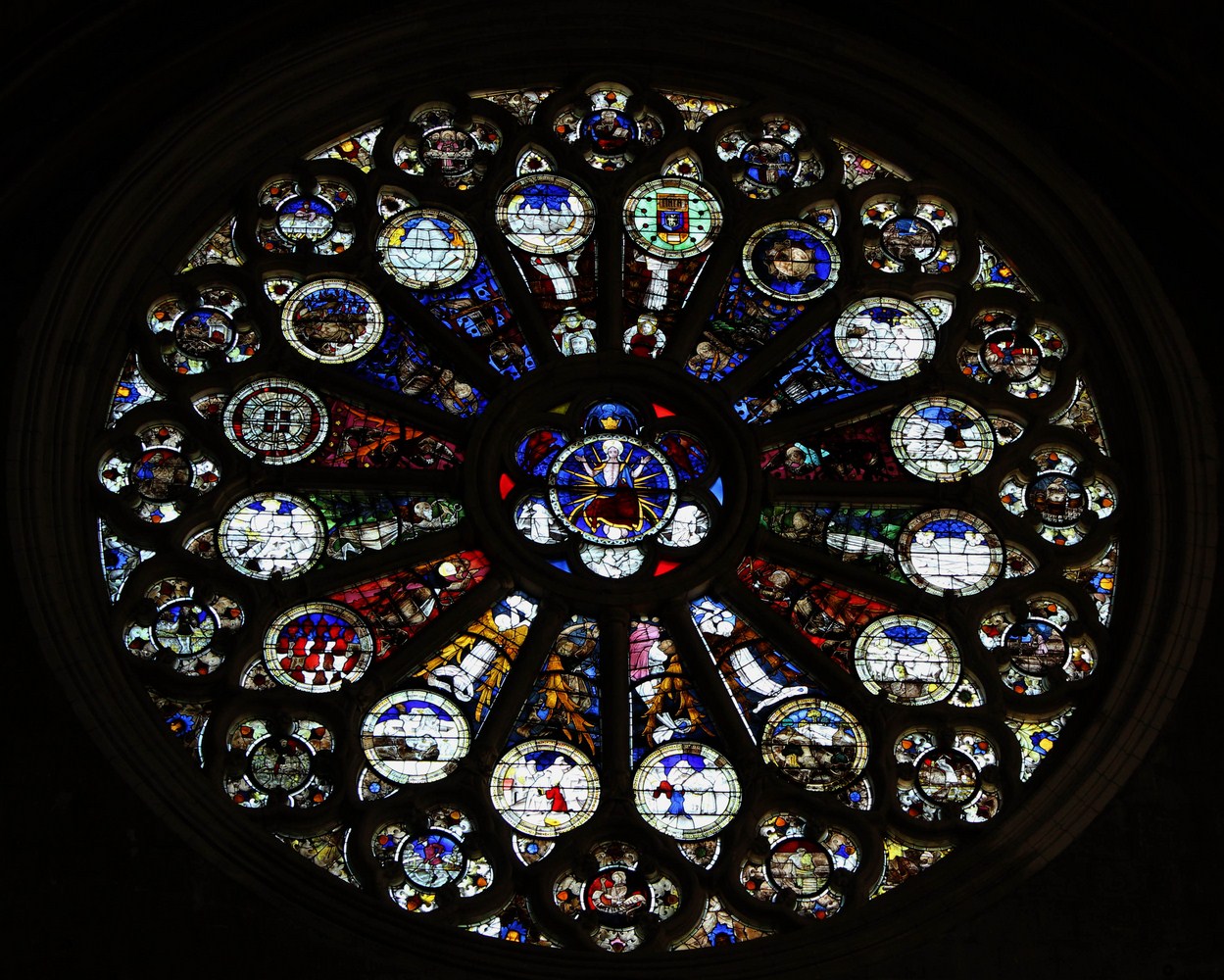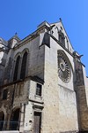 ► Les rosaces sud et nord du transept sont également intéressantes 🗎⮵. Datant de 1451 et réalisés par André Robin, leur symbolisme est très riche et complémentaire. Pour la première il s’agit d’un Christ en majesté entouré dans la partie supérieure des signes du zodiaque et dans la partie inférieure des métiers Humains correspondants. Aux extrémités, des anges sont munis d’attributs symboliques dont des instruments. Les rayons sont remplis de lys et de chardons. La rosace nord quant à elle, représente le Christ aux plaies entouré de divers états de la Nature. Aux extrémités, sont représentées symboliquement plusieurs opérations, les rayons sont eux remplis des Armes du Christ.
