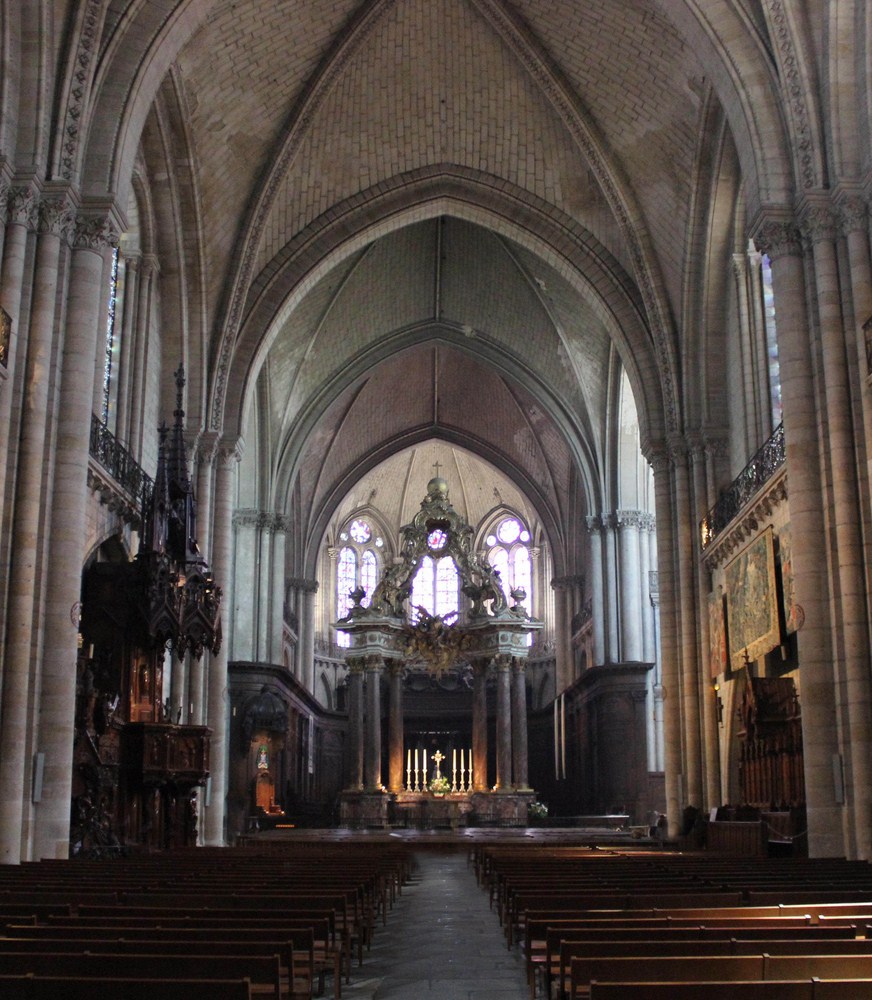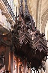 ◆ Une pièce du mobilier est aussi remarquable. Il s’agit de la chaire à prêcher néogothique de l’abbé Choyer 🗎⮵ datant du milieu du XIX et ayant demandé trois ans de travail. Du côté gauche on observe l’ancienne Loi et les Prophètes, au coté droit, une allégorie፧ des passages du Nouveau Testament, de haut en bas une église militante et matérielle et en haut, une église triomphante et spirituelle représentée par la Jérusalem Céleste. Détail intéressant, on remarque à l’intérieur de la sculpture des abat-son de la forme des voûtes caractéristiques de la cathédrale.