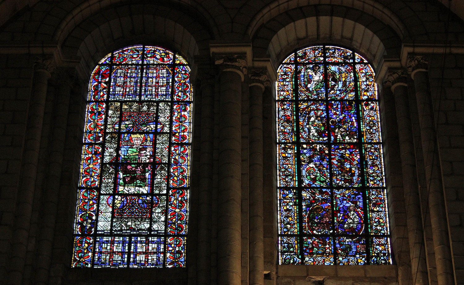 ► Les vitraux sont aussi une part importante du patrimoine visible dans la cathédrale. Le Vitrail de l’Enfance du Christ 🗎⮵ est le plus ancien vitrail de l’édifice et date d’environ 1160. Il comporte quatre scènes dans des médaillons : trois relatent l’enfance du Christ(1) et la dernière la Vocation de saint Pierre et Saint André. Le Vitrail de la Vierge à l’Enfant 🗎⮵ date quant à lui de la fin du XII et est proche de la Belle Verrière de Chartres, représentant tout comme lui une Vierge romane. De part ses spécificités, il s’agit d’un exemple intéressant de la peinture sur verre de cette époque, témoin de la vitalité artistique angevine.