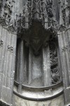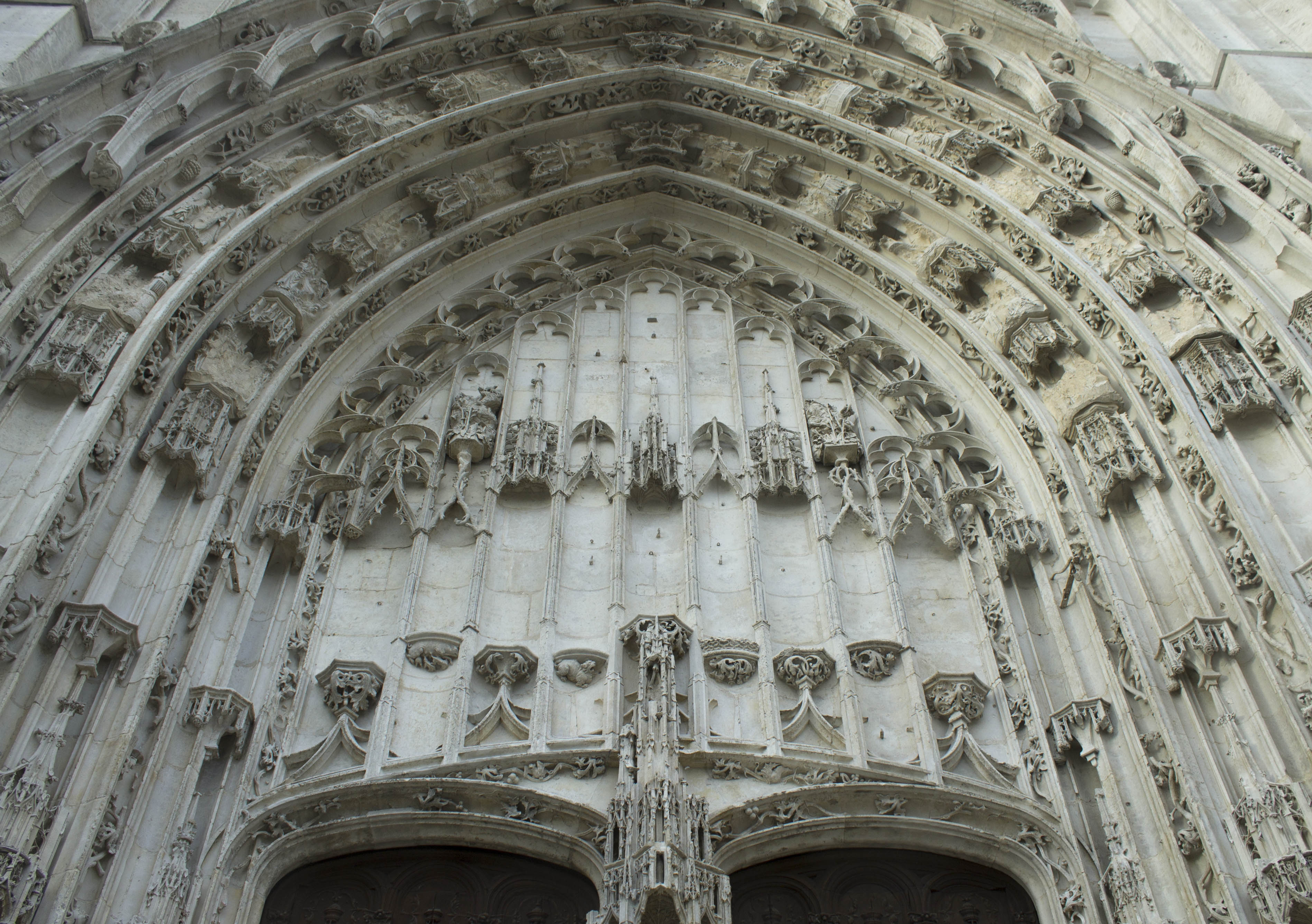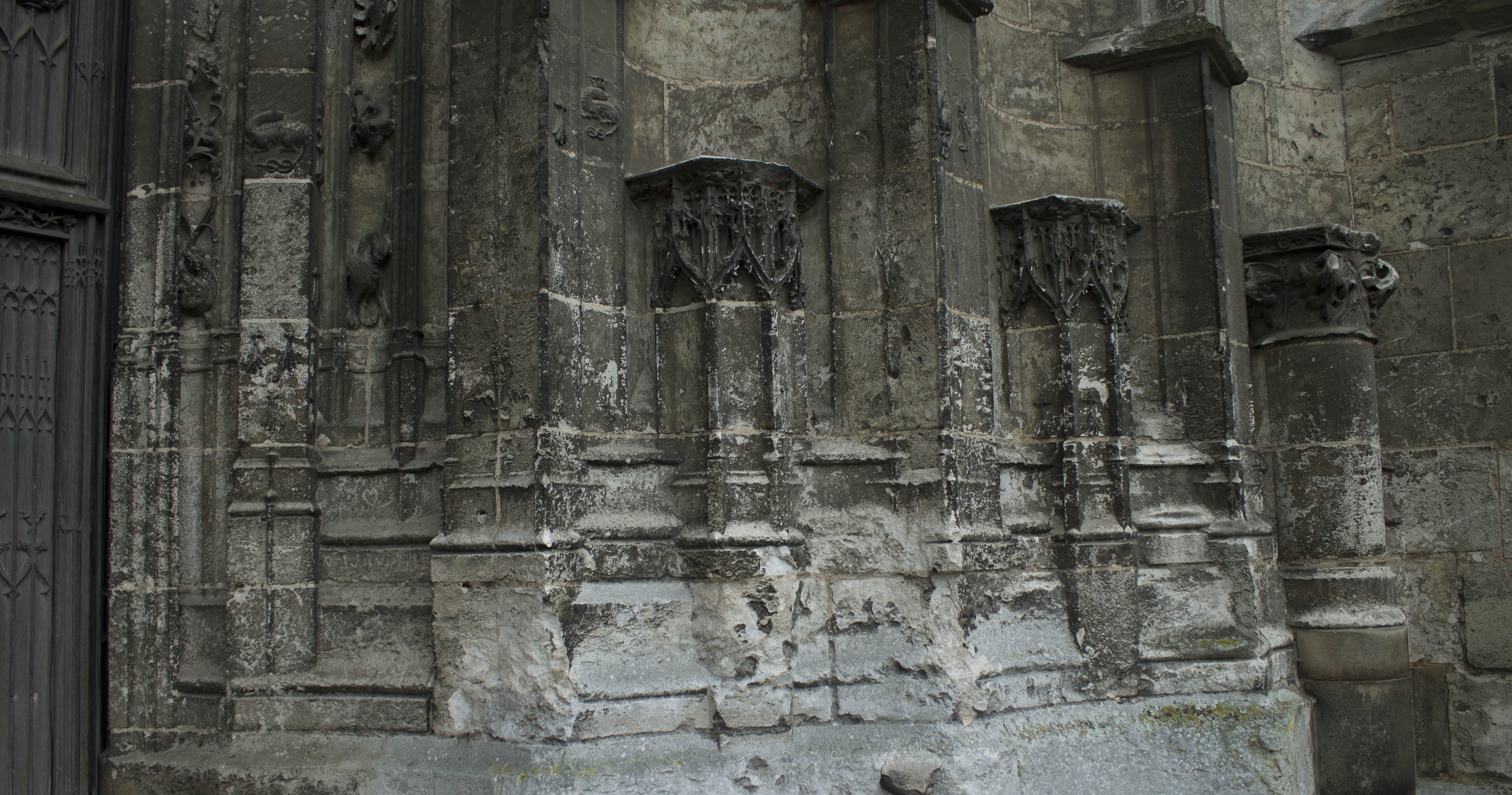 Détails du portail sud avec les quelques statuettes qu’il lui reste et ses nombreux motifs végétaux, le ventail de Saint-Pierre est de 1540.