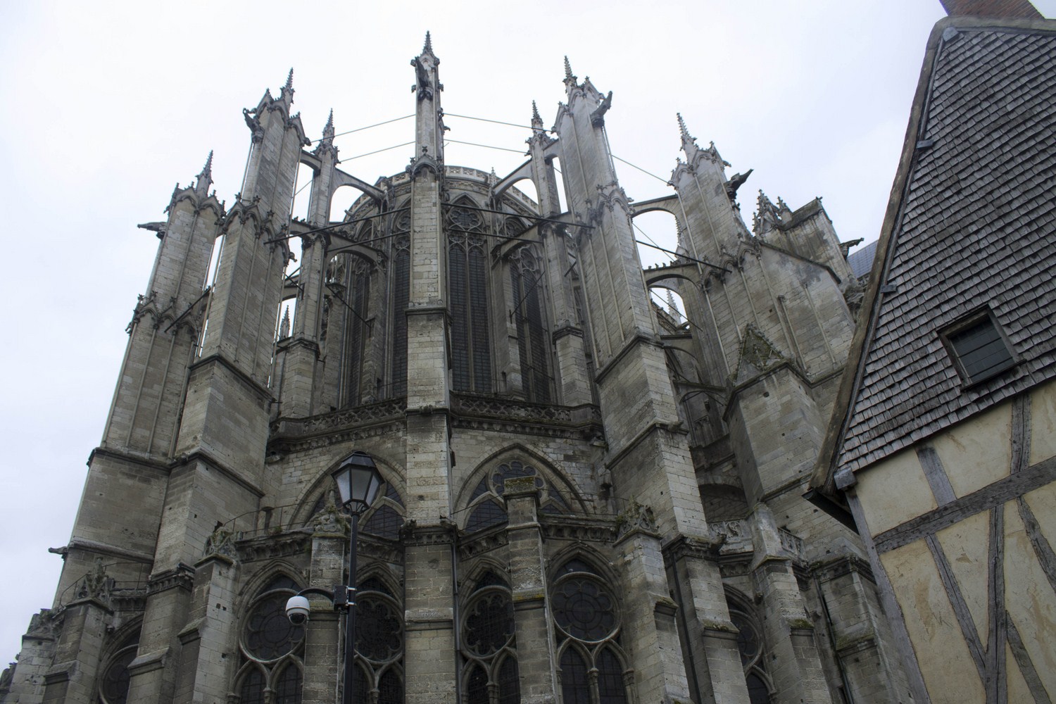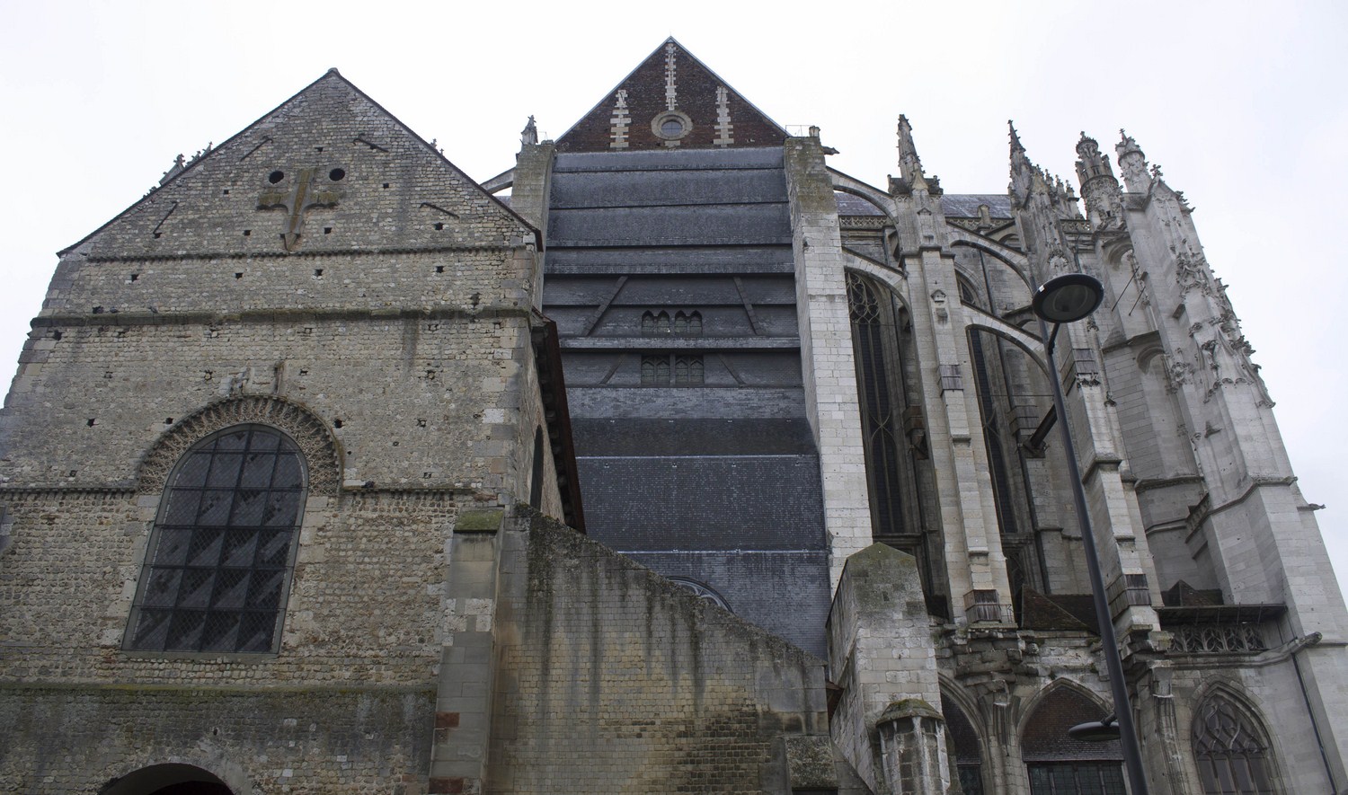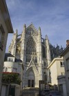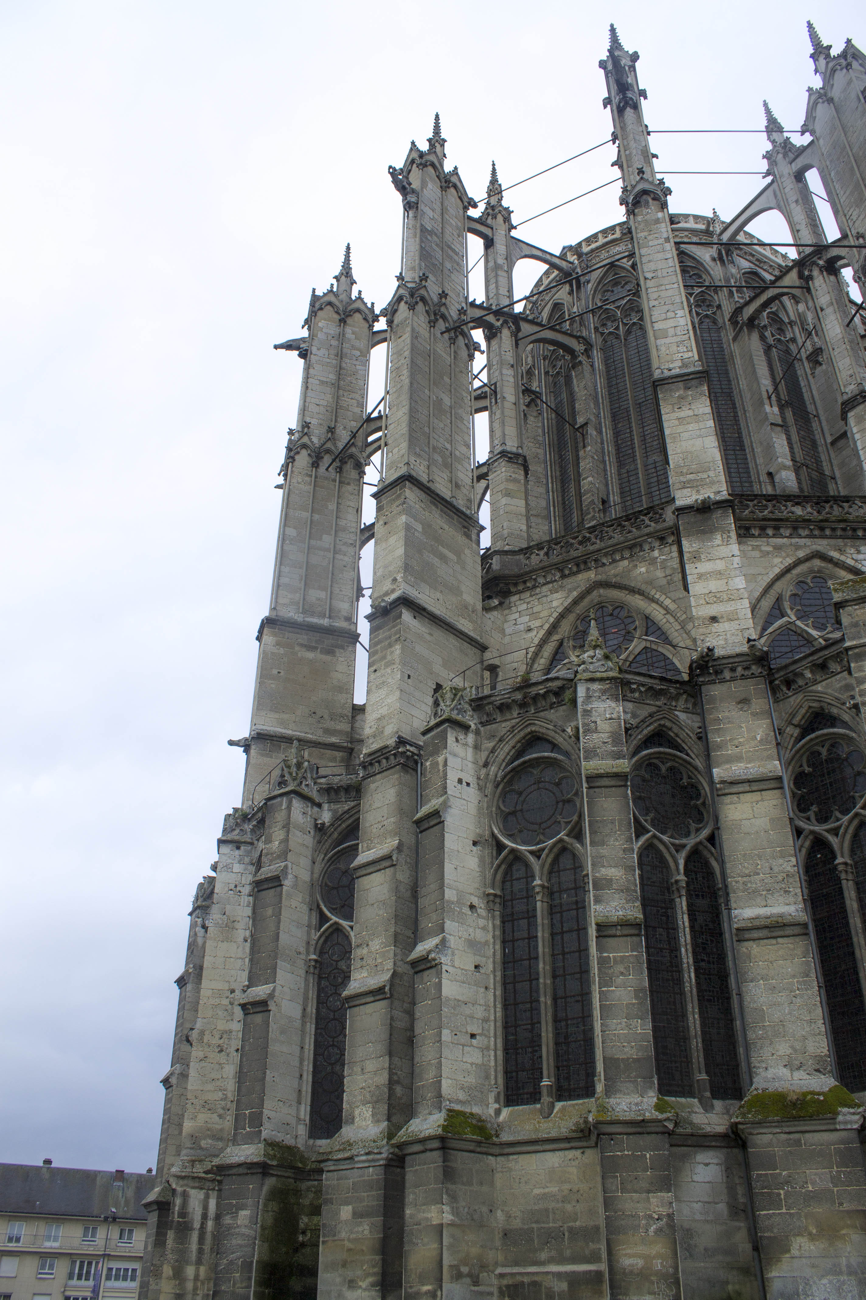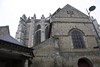 Le chevet qui se distingue par sa hauteur puis vue sur la façade sud et le chevet, soutenu par de nombreux arcs-boutants.