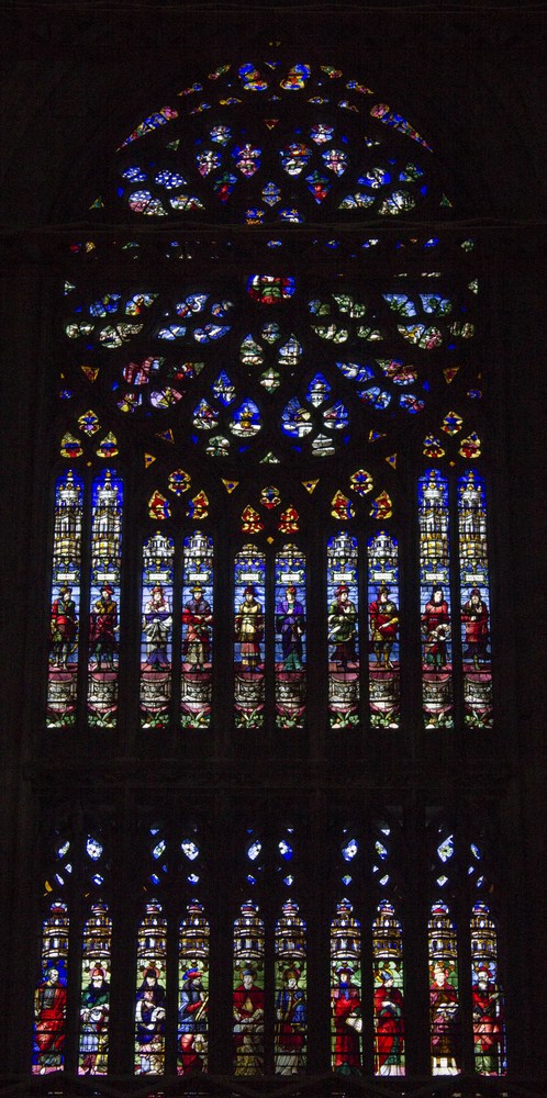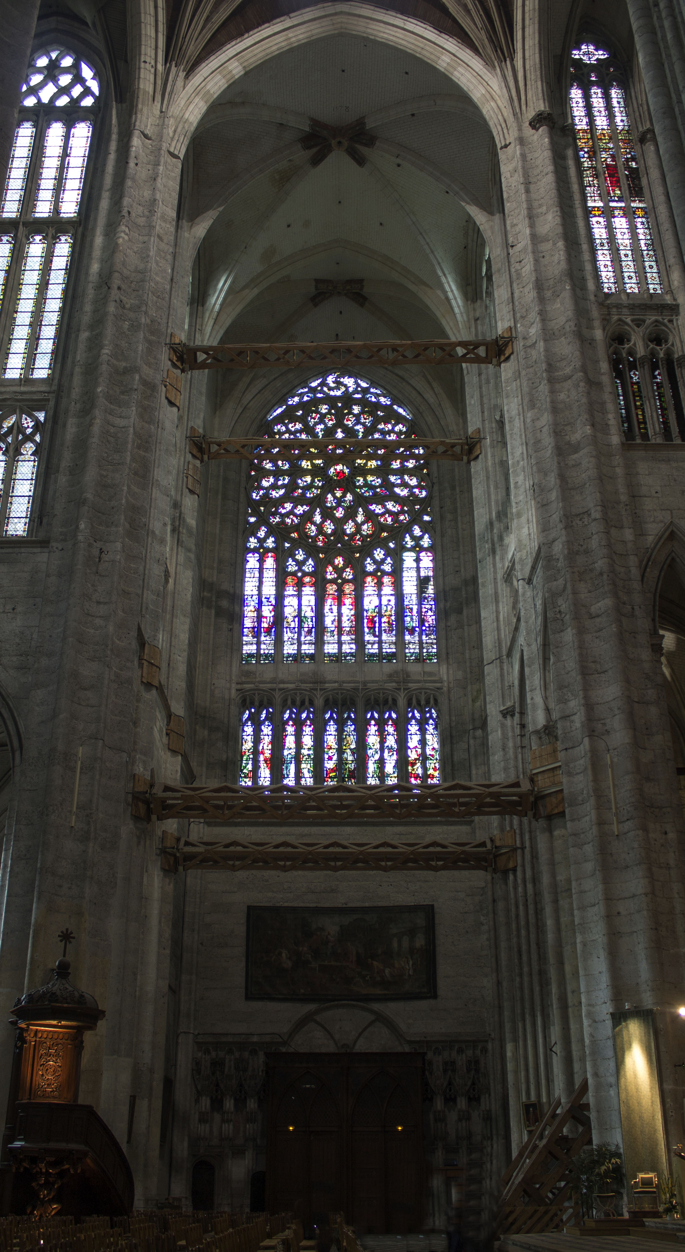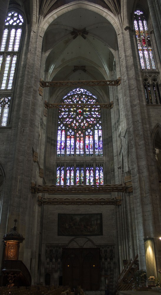 Bras nord du transept où l’on voit les tirant métalliques. Les vitraux du XX représentent le Christ juge et tout en bas les vierges sages et les vierges folles Au milieu, dix Sibylles du XVI.