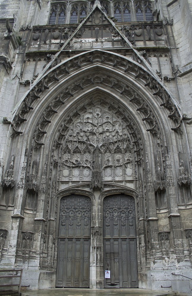 Détails du portail nord, notamment ses vantaux en bois sculpté du XVI représentant évangélistes, docteurs de l’Église et sibylles. On voit aussi que François Ier avait donné des fonds au XVI