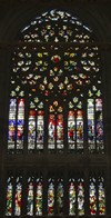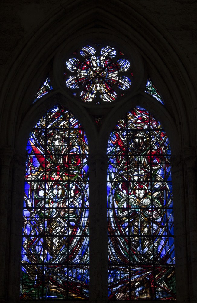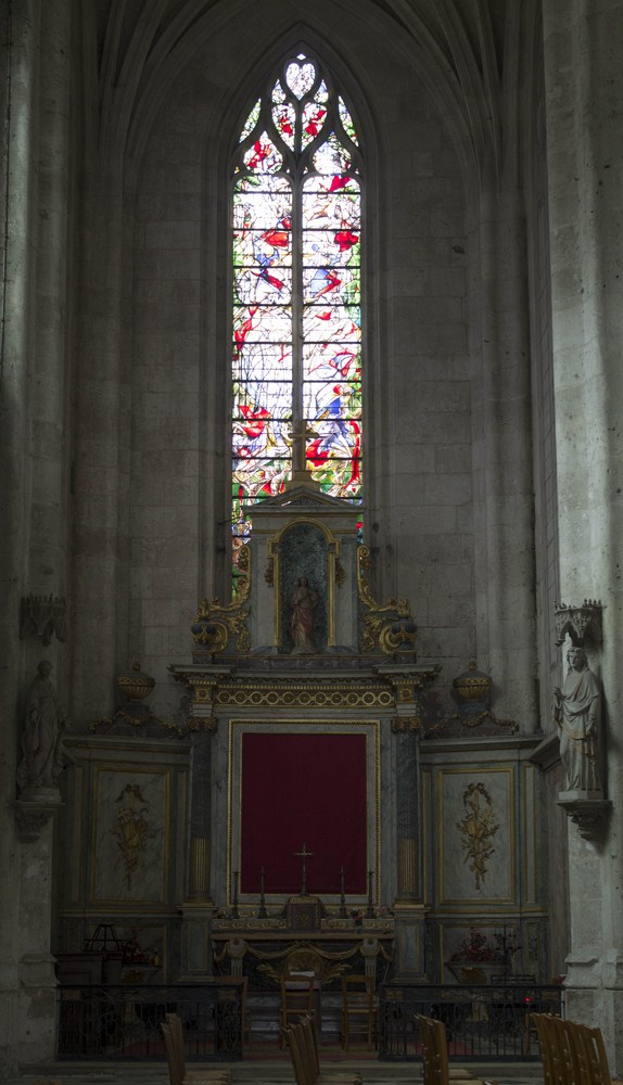 Vitraux du XVI au transept sud, composés en haut de la Rose de la création, plus bas de dix prophètes, puis saint Pierre et saint Paul entourant les quatre évangélistes et quatre Docteurs de l’Église.