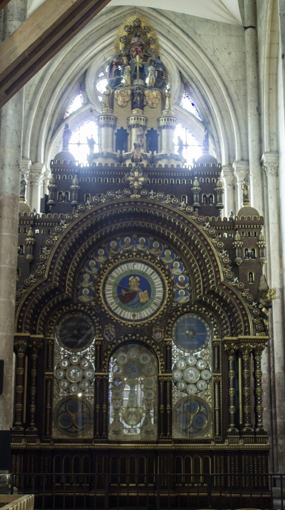 ◆ La cathédrale dispose de deux pièces uniques 🗎⮵ : une des plus anciennes horloges à carillons au monde encore en fonctionnement et datant du XIV ainsi qu’une seconde horloge, astronomique cette fois et romano-byzantine. Elle a été fabriquée entre 1865 et 1868 par Auguste-Lucien Vérité, est faite de 90 000 pièces, 52 cadrans et disposant de 68 automates.