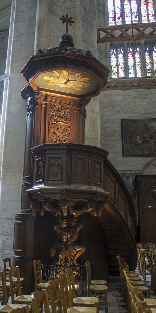 Originellement située à l’abbaye de Saint-Lucien, la chaire à prêcher de la s.m du XVII, est dans la cathédrale depuis 1805. Ses panneaux figurent des saints céphalophores.