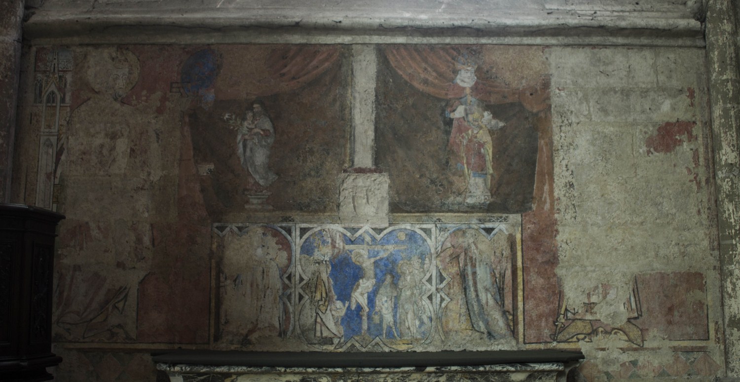 Ancienne fresque du XIV située dans la Chapelle des Fonts baptismaux, on y distingue un saint (probablement deux) en face d’un crucifiement.