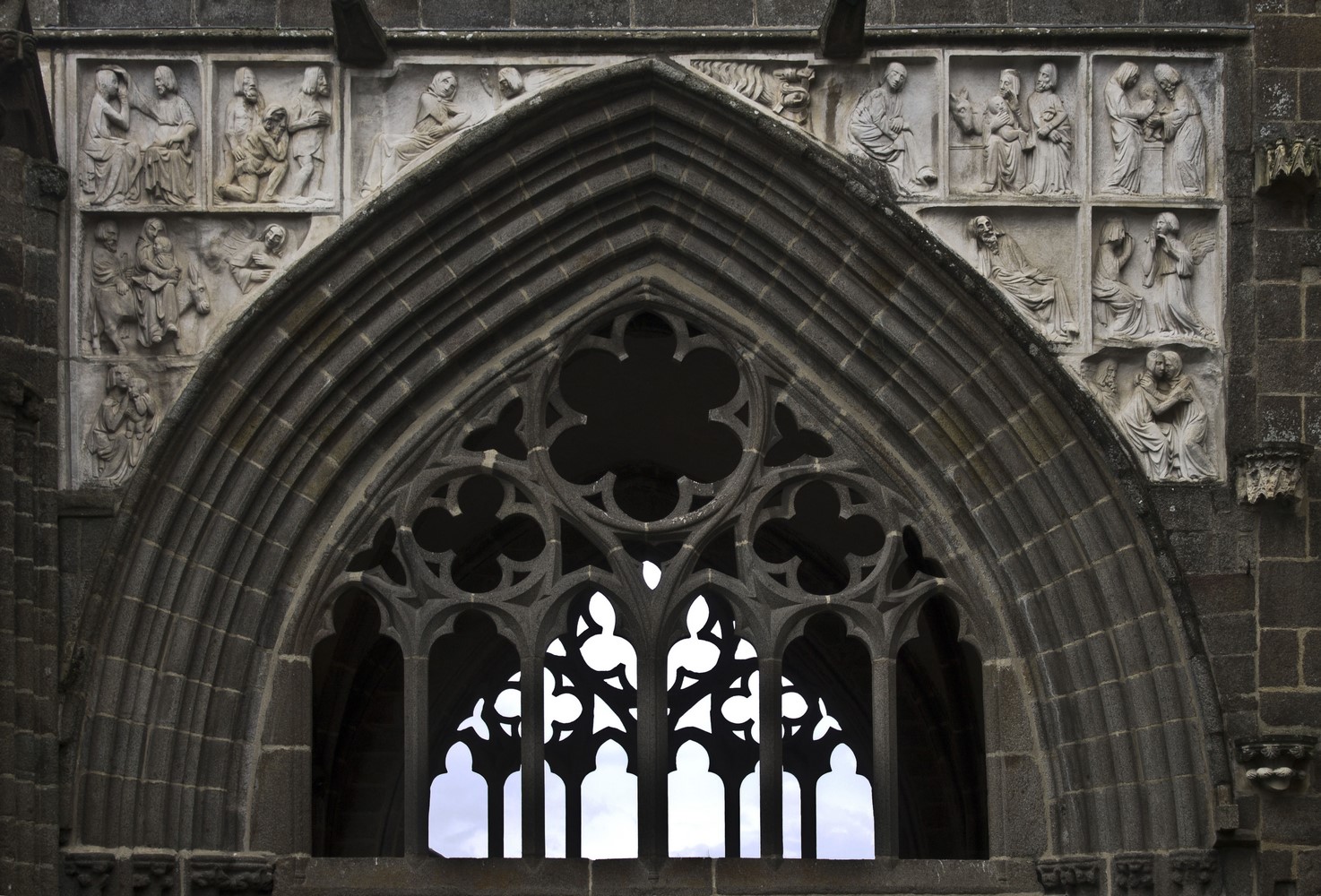 ► À l’extérieur, le Porche Saint-Magloire est l’élément le plus ouvragé, les trois arc-brisés de l’extension sont surmonté de bas reliefs racontant la vie du Christ. L’arc ouest est orné de 42 statuettes de saints.