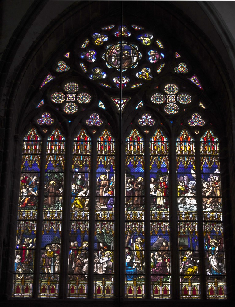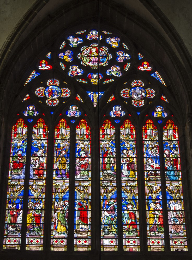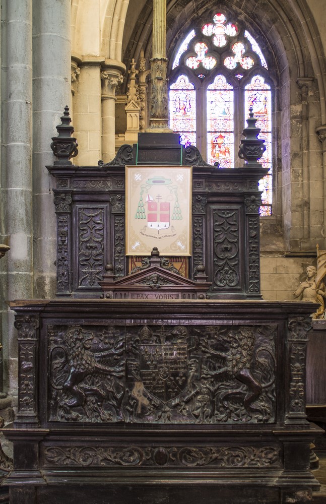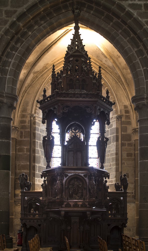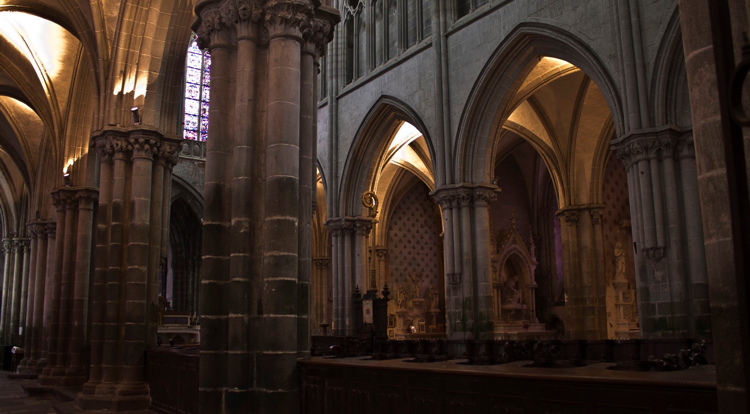 ► Le destin tragique de l’ancien archevêché fait qu’aujourd’hui on appelle "cathédrale", un édifice qui n’est plus qu’un témoignage du passé d’un lieu clef dans le rayonnement du christianisme breton. La déchristianisation révolutionnaire à eu raison d’une grande partie des mobiliers, en particulier l’ancien jubé qui fermait le chœur. Les stalles du XIV restent l’élément le plus authentiquement représentatif de l’ancienne importance du lieu. Des vitraux du XIII ont aussi miraculeusement traversé les siècles, non sans quelques désagréments, en particulier la maîtresse-vitre du chevet qui racontent en 48 médaillons la vie de plusieurs saints, la Passion ou encore l’enfance du Christ.