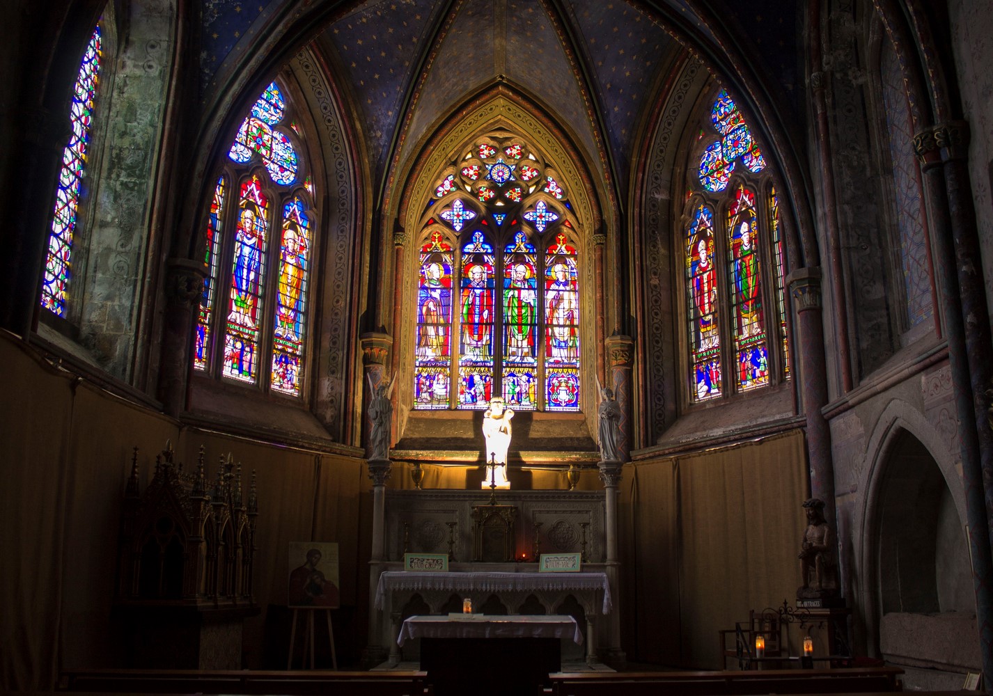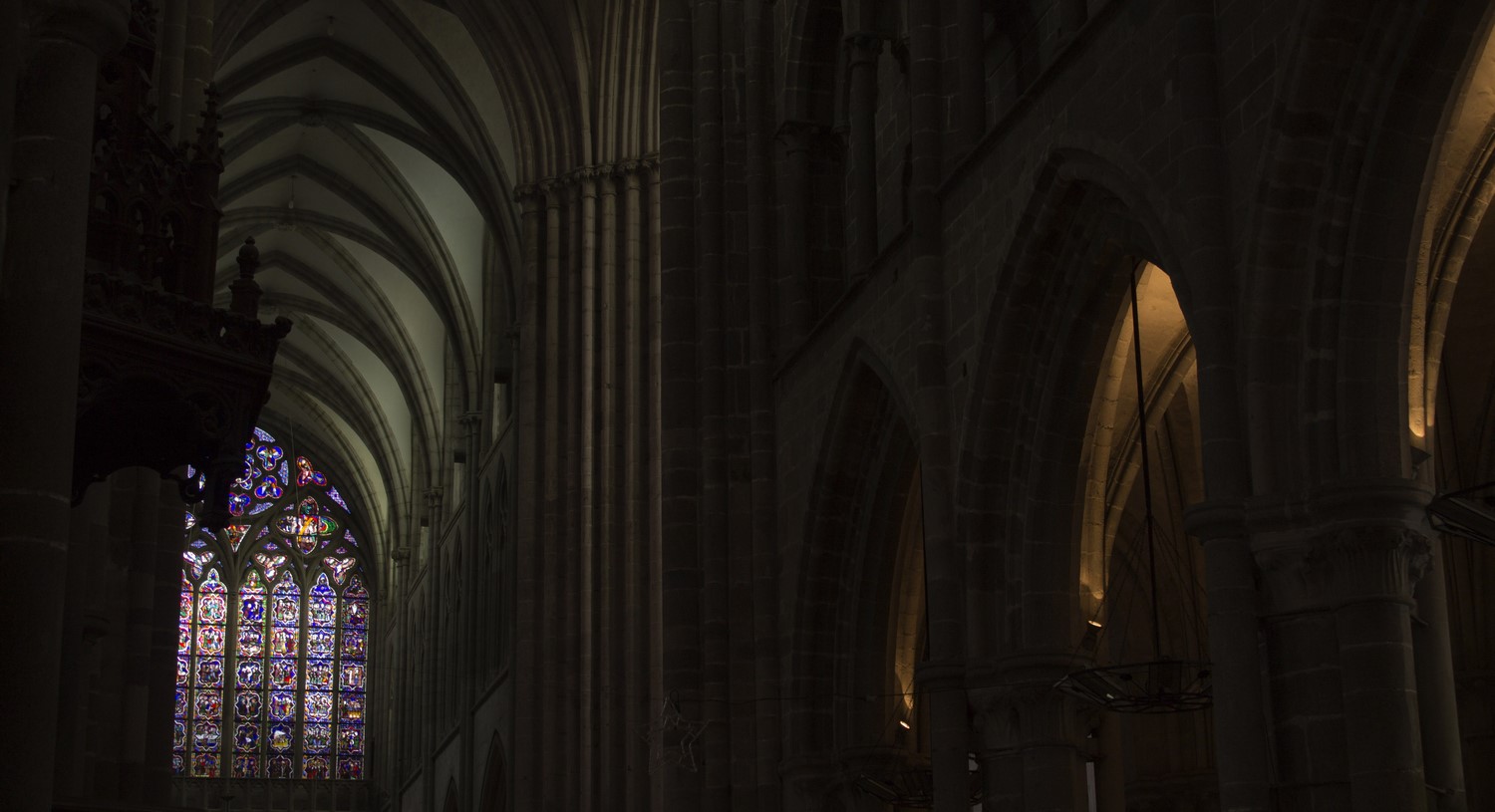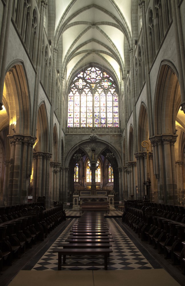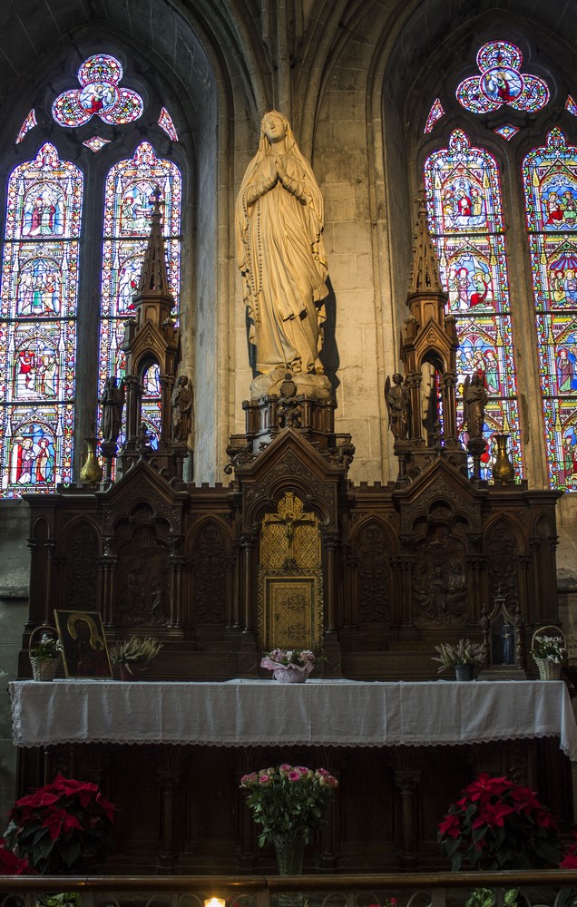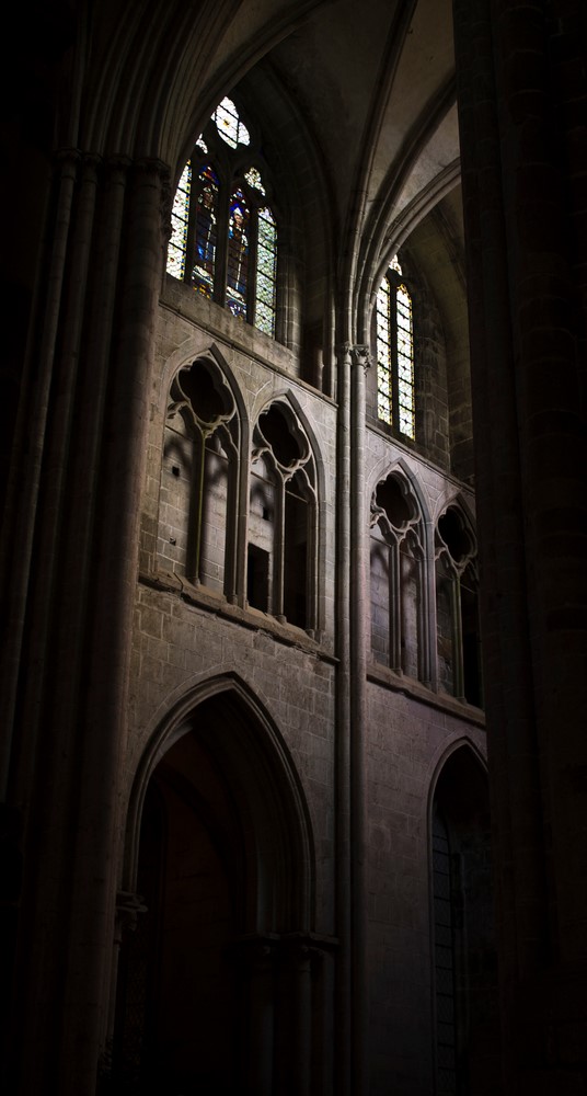 ► Le destin tragique de l’ancien archevêché fait qu’aujourd’hui on appelle "cathédrale", un édifice qui n’est plus qu’un témoignage du passé d’un lieu clef dans le rayonnement du christianisme breton. La déchristianisation révolutionnaire à eu raison d’une grande partie des mobiliers, en particulier l’ancien jubé qui fermait le chœur. Les stalles du XIV restent l’élément le plus authentiquement représentatif de l’ancienne importance du lieu. Des vitraux du XIII ont aussi miraculeusement traversé les siècles, non sans quelques désagréments, en particulier la maîtresse-vitre du chevet qui racontent en 48 médaillons la vie de plusieurs saints, la Passion ou encore l’enfance du Christ.